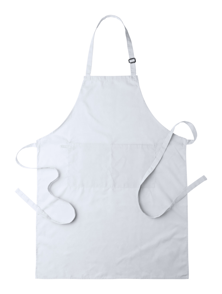 Gekleurd schort met voorzakken. Materiaal: 80% polyester / 20% katoen.