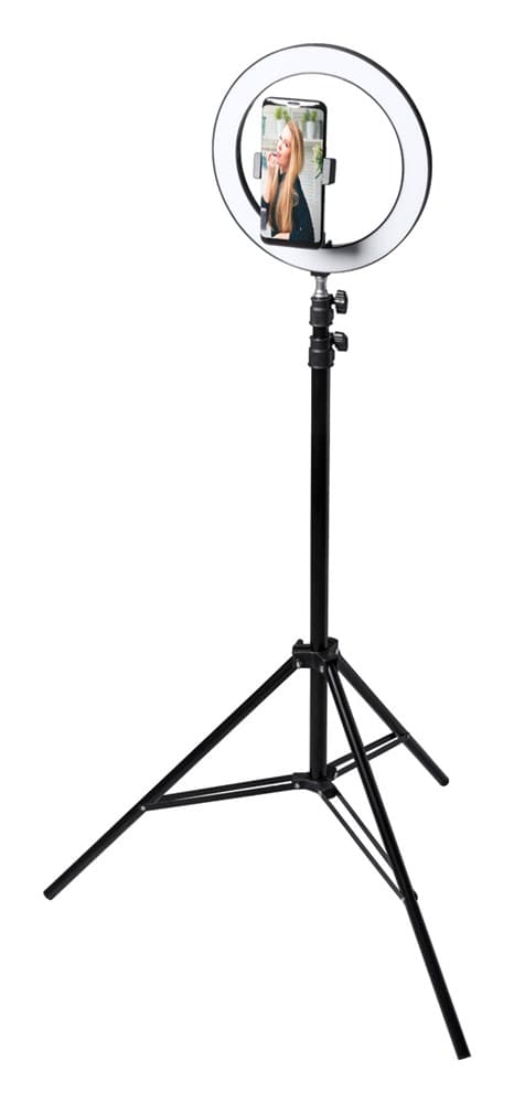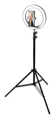 Selfie ringlamp met verstelbare statief en telefoon houder. Met 120 LED's en instelbare helderheid. Inclusief USB-oplaadkabel.
