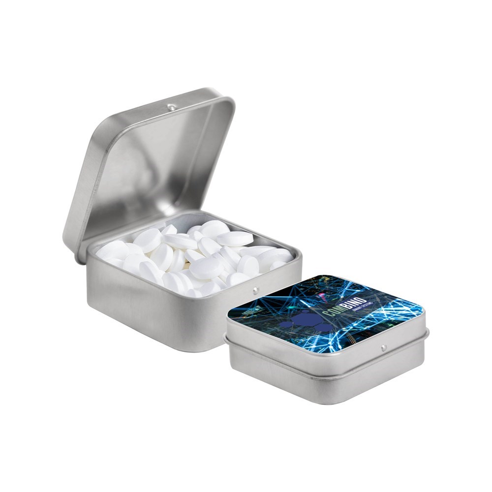 Kubus blikje wit met ca. 23 gram pepermunt en voorzien van een full colour bedrukking. Inclusief ingrediëntensticker en seal.