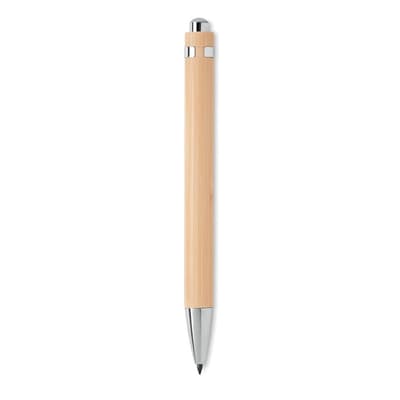 Langdurige inktloze pen met drukknop, bamboe huls en glanzend chroom beslag. Deze pen heeft een punt van een metaallegering en terwijl je schrijft, oxideert het oppervlak van het papier zonder resten achter te laten. Bamboe is een natuurlijk product, de kleur per artikel kan verschillen.