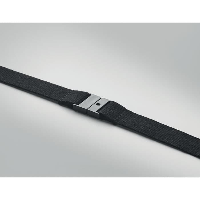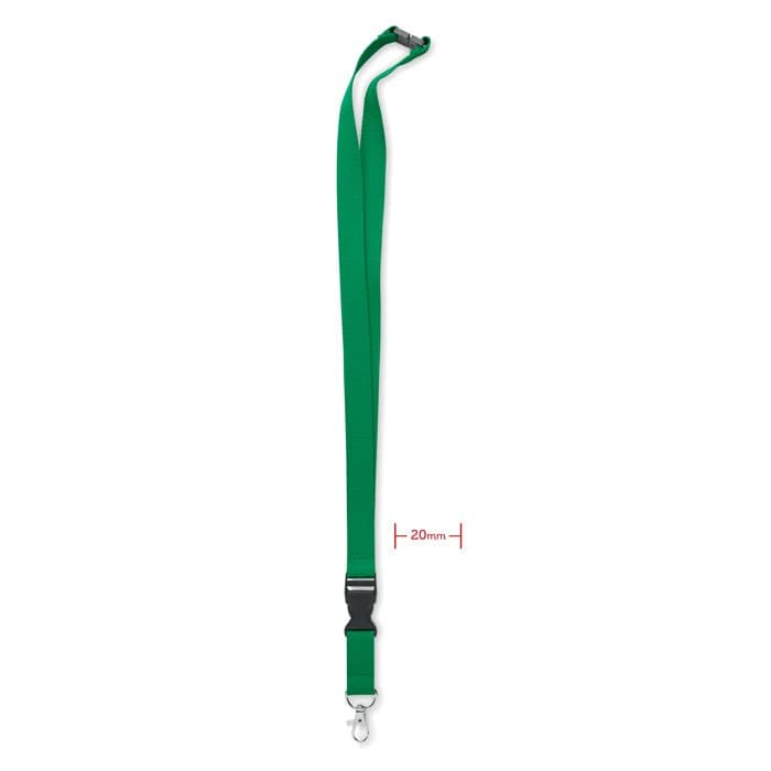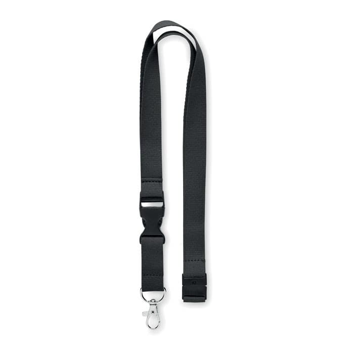 Katoenen lanyard met metalen haak, afneembare gesp en veiligheidssluiting. 20 mm breed.