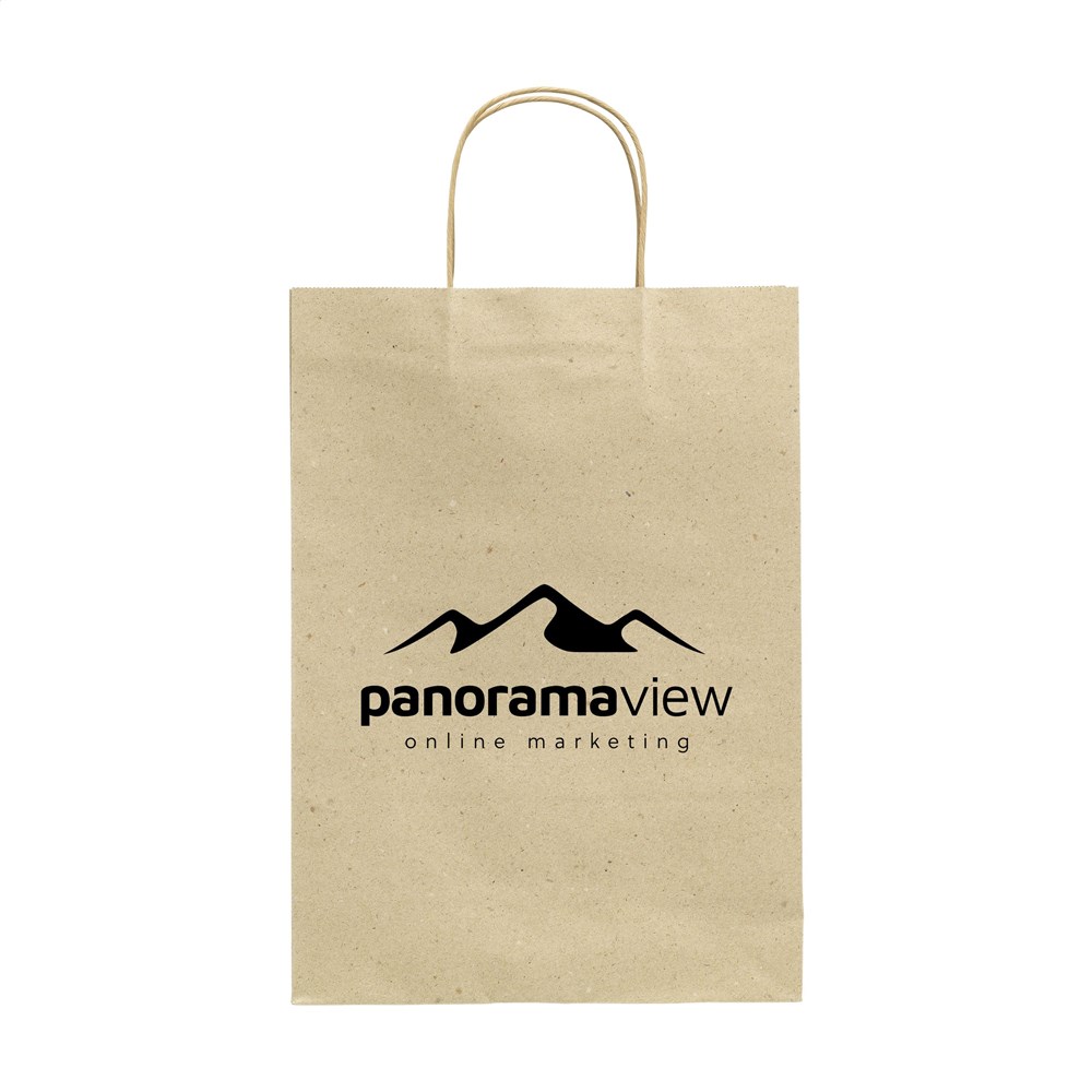 WoW! Stevige papieren geschenktas (maat L) gemaakt van gerecycled graspapier (120 g/m²). Door het gebruik van natuurlijke materialen zijn oneffenheden in het papier voelbaar. Dit geeft het product een mooie natuurlijke uitstraling. De tas heeft twee korte papieren draaglussen, een gevouwen bodem en een zijvouw. Voor de productie van deze tas worden geen bomen gekapt.