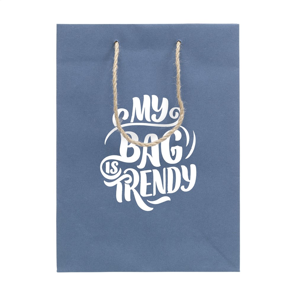 WoW! Stevige Egeschenktas (maat M) gemaakt van gerecycled papier met jeansvezels (180 g/m²). Door het gebruik van gerecyclede jeansstoffen kan de kleur blauw per tas verschillen. De blauwe kleur geeft de tas een trendy uitstraling. De tas heeft twee korte jute draaglussen, een gevouwen bodem en een zijvouw. Geschikt voor allerlei promotionele doeleinden. Voor de productie van deze tas worden geen bomen gekapt.