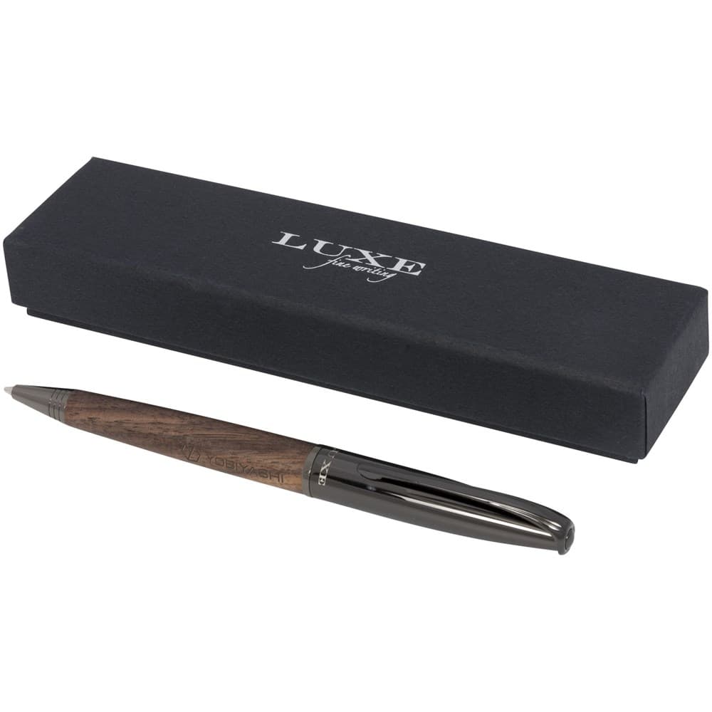 Balpen met draaimechanisme en huls met houten look, gemaakt van verchroomd brons, geleverd in een luxe geschenkverpakking. Grootte van de balpen: 14,1 cm, 1,2 cm, gewicht: 26 gr, schrijflengte: 1500 m.