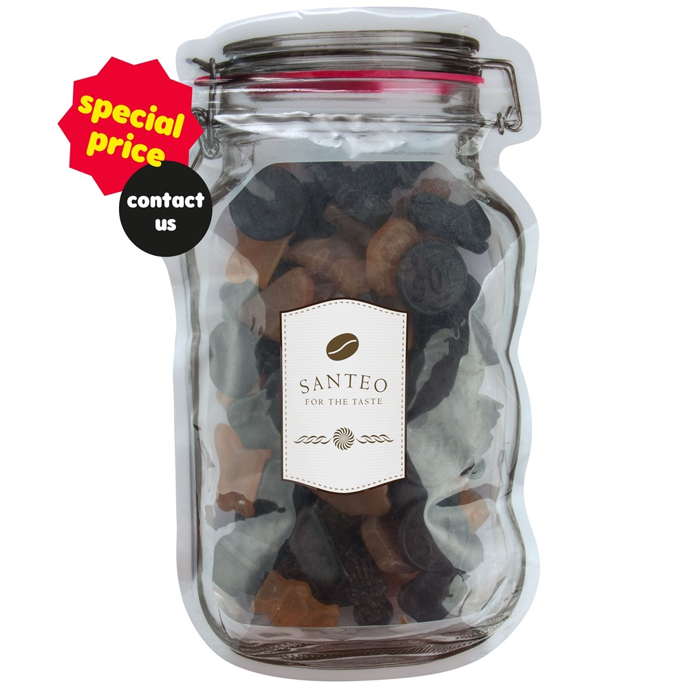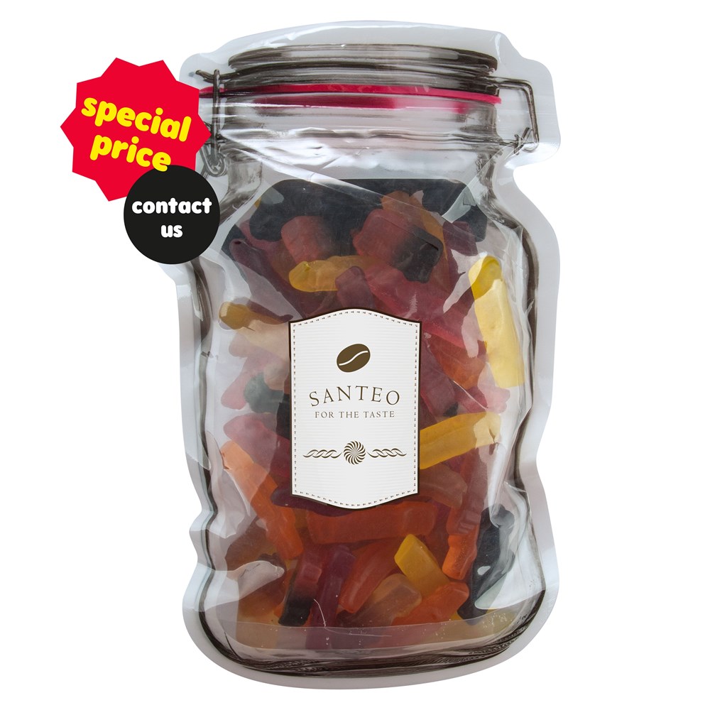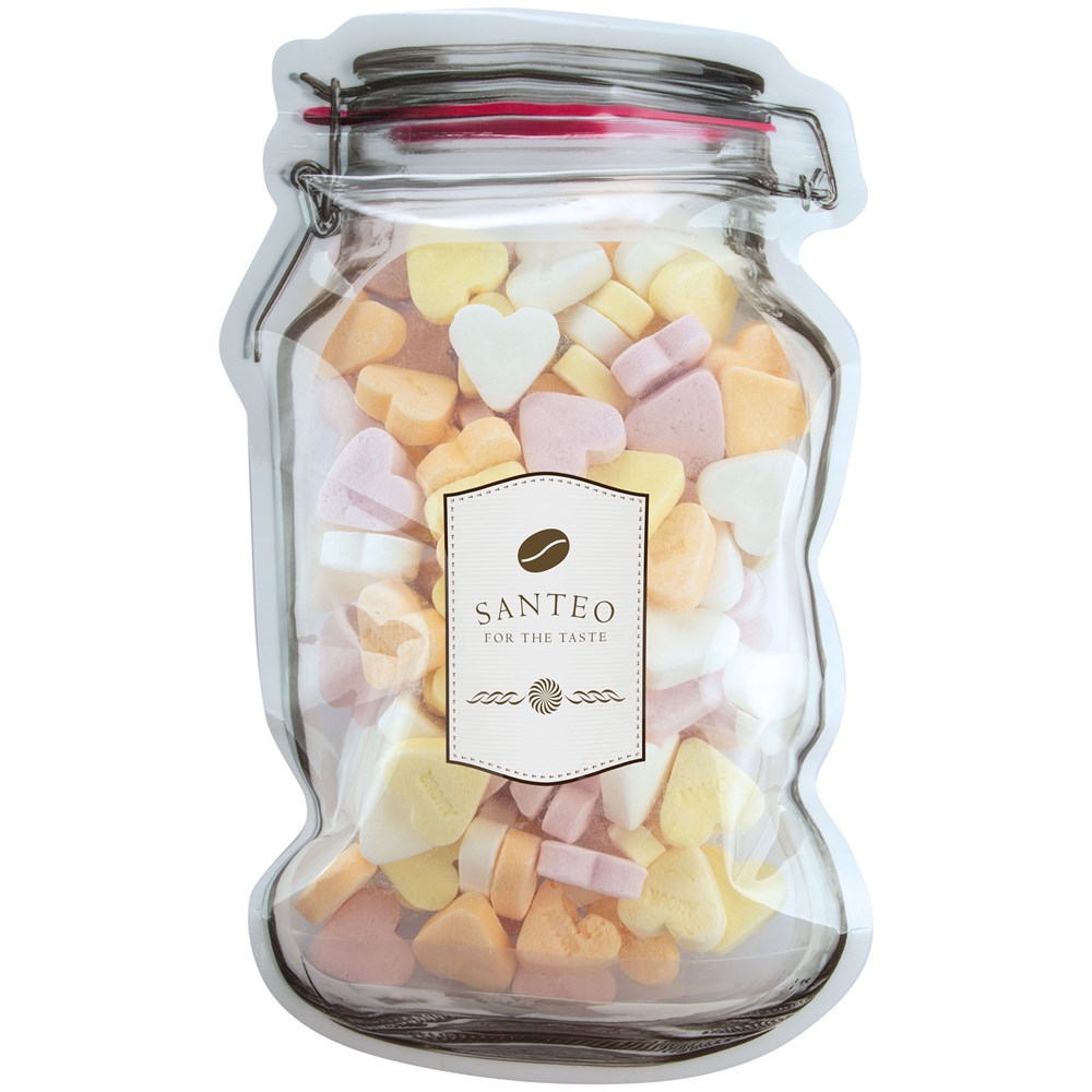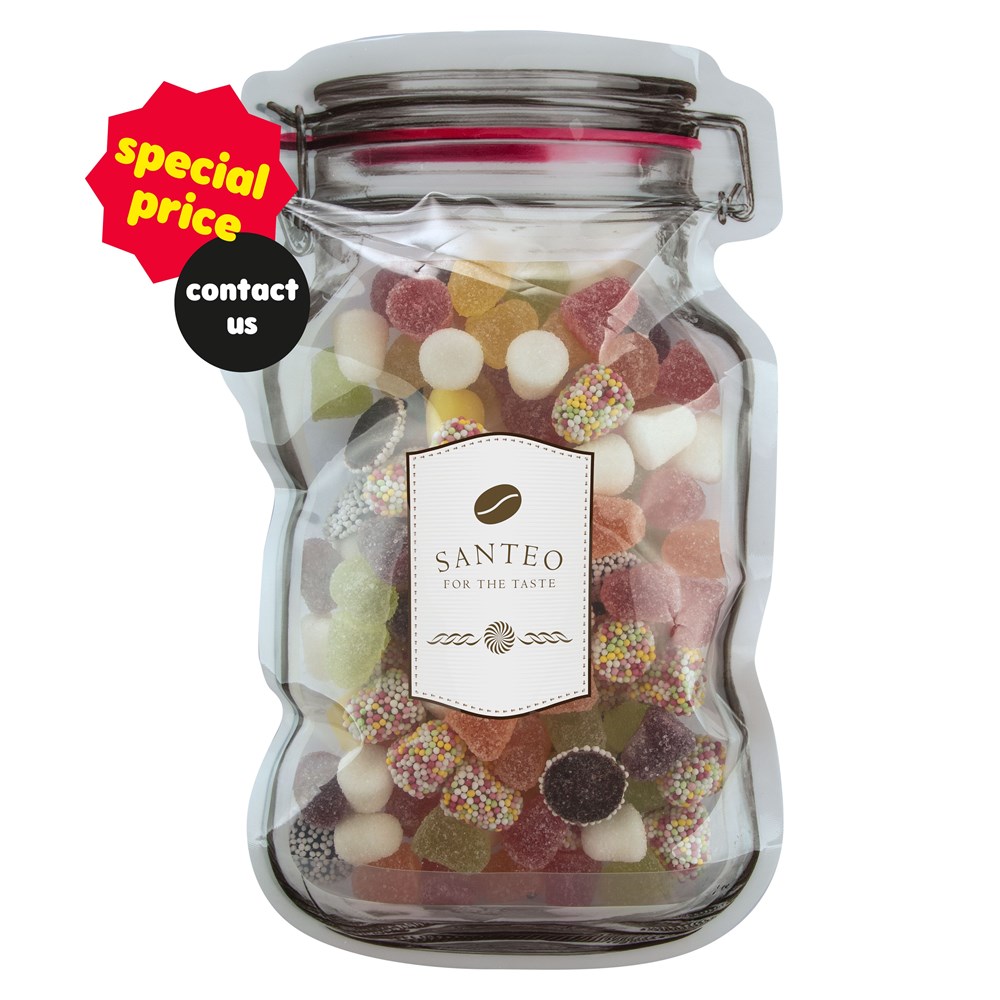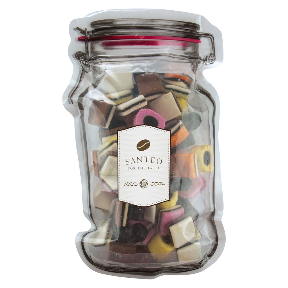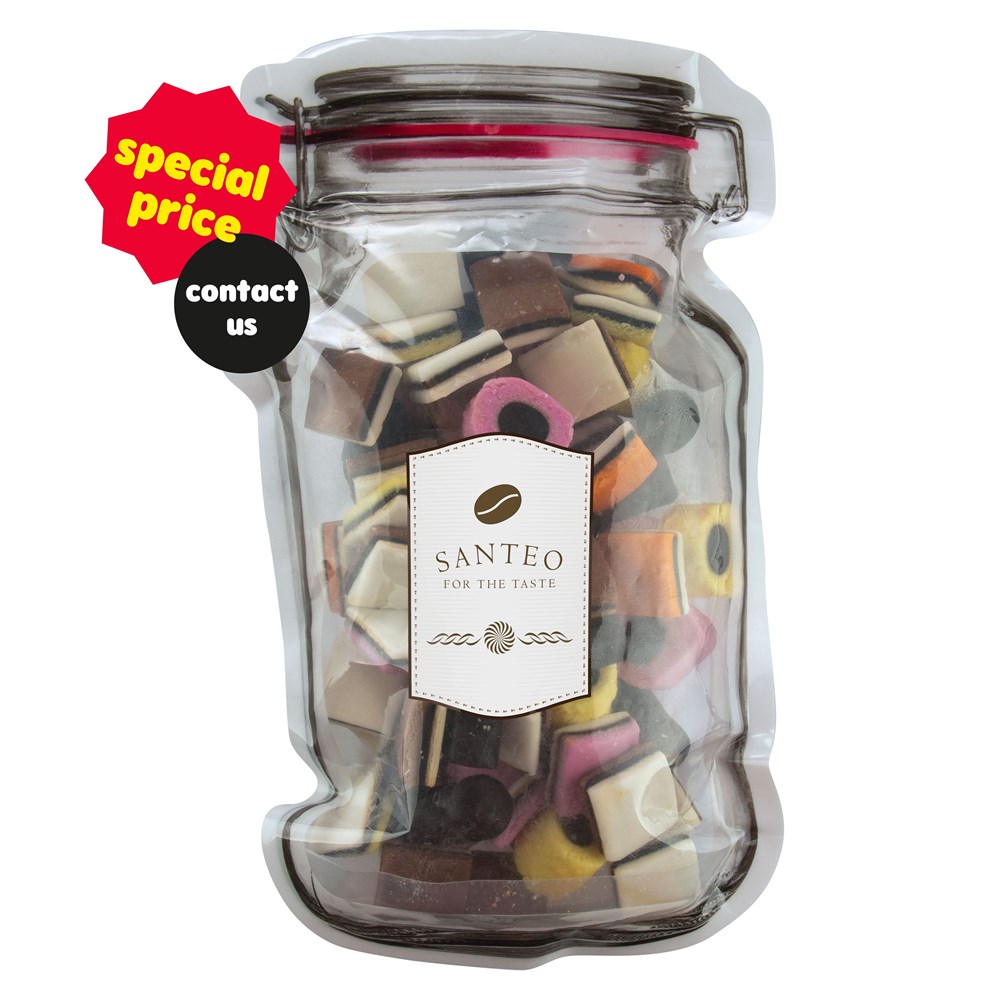 Mailing weckpot maxi gevuld met dropstaafjes en voorzien van een full colour sticker in eigen vorm