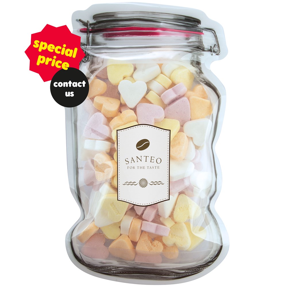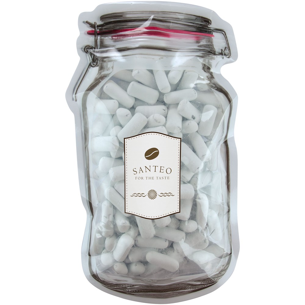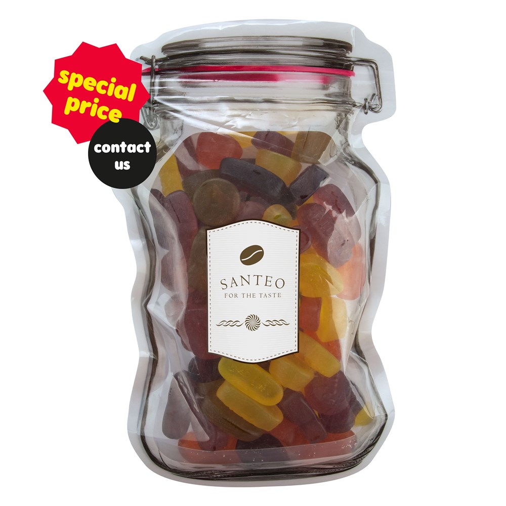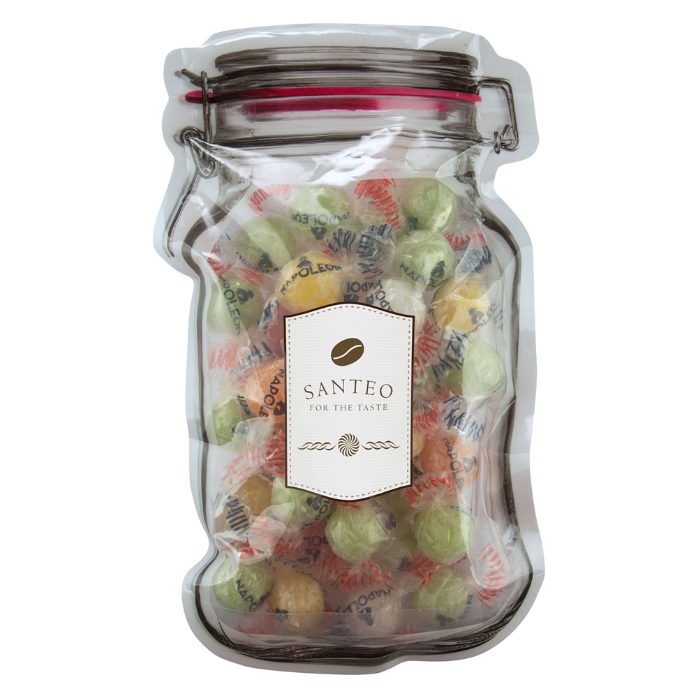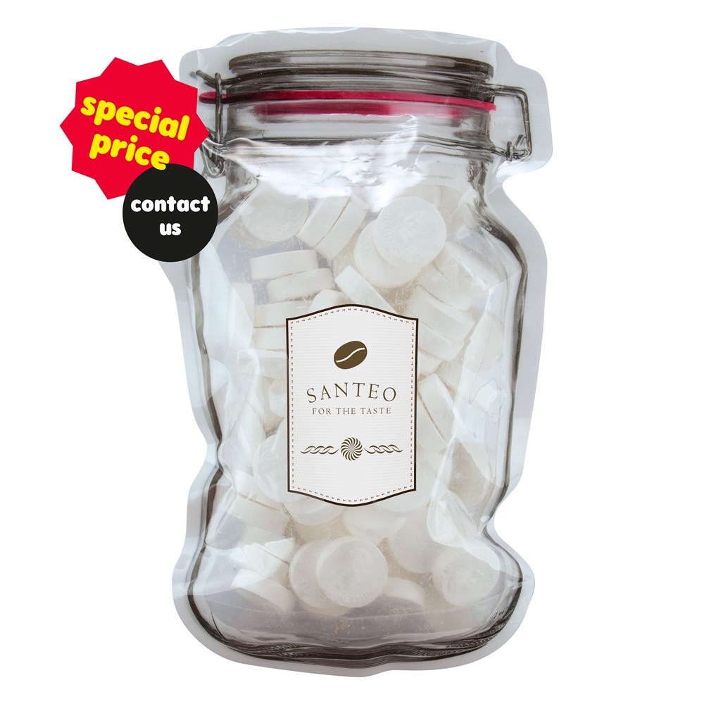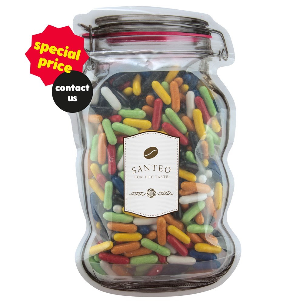 Mailing weckpot maxi gevuld met dropstaafjes en voorzien van een full colour sticker in eigen vorm