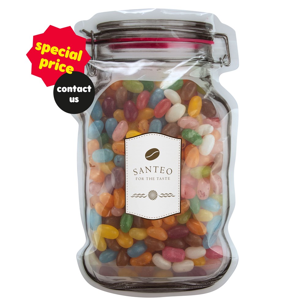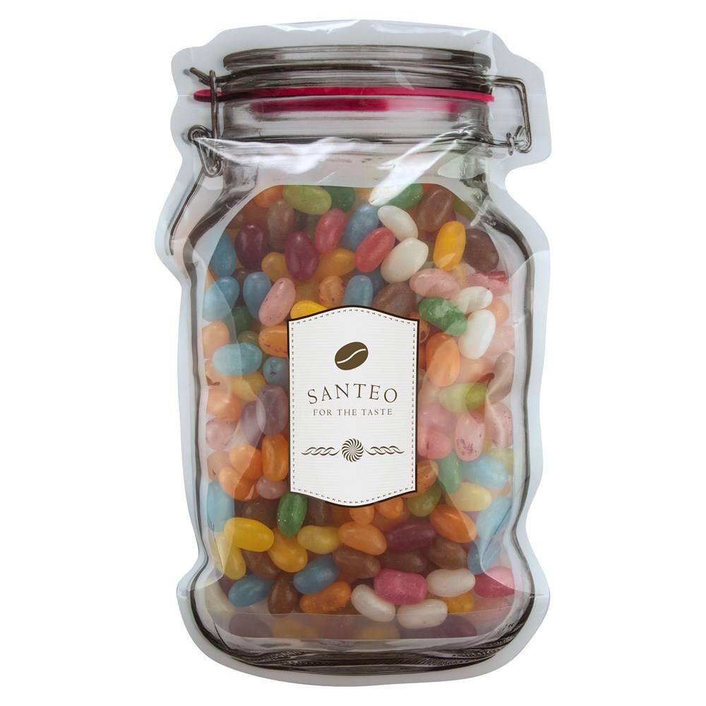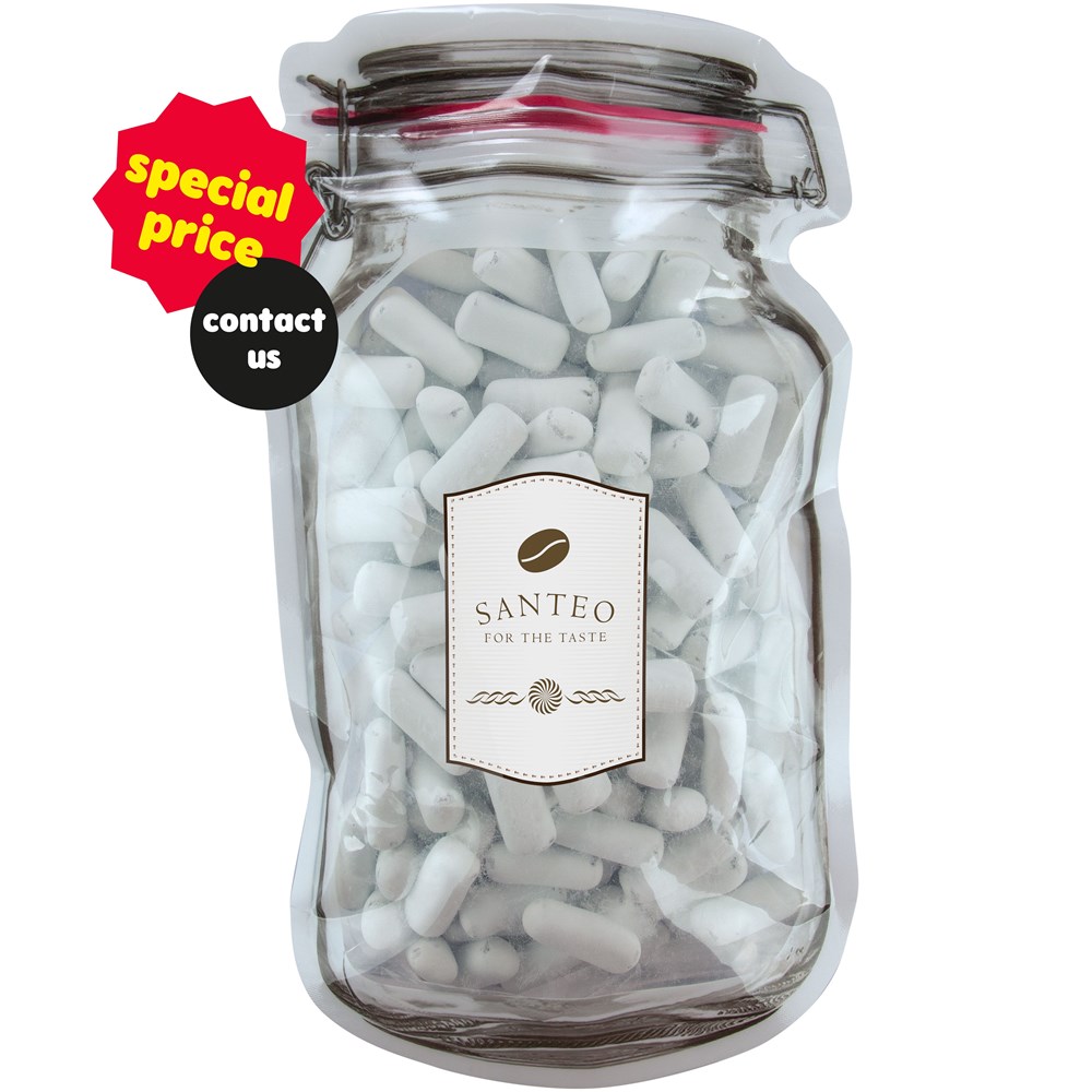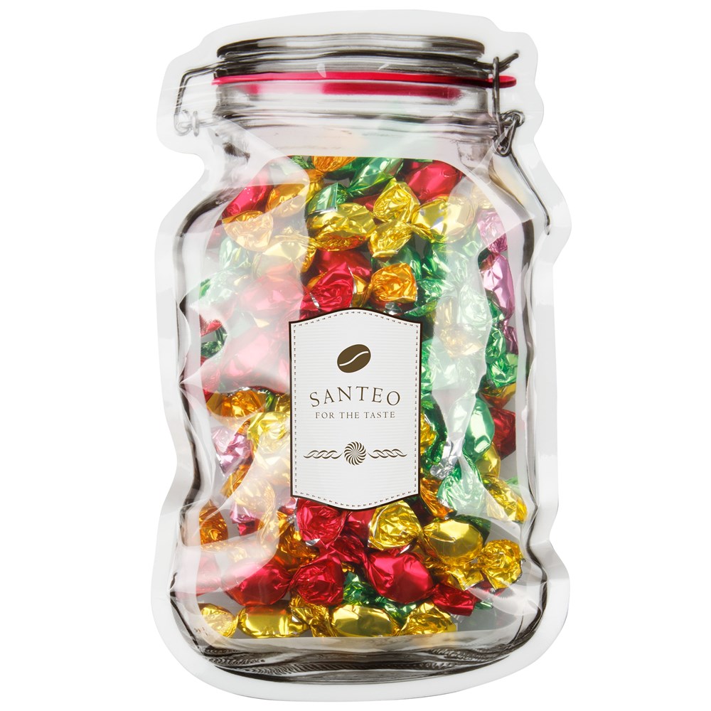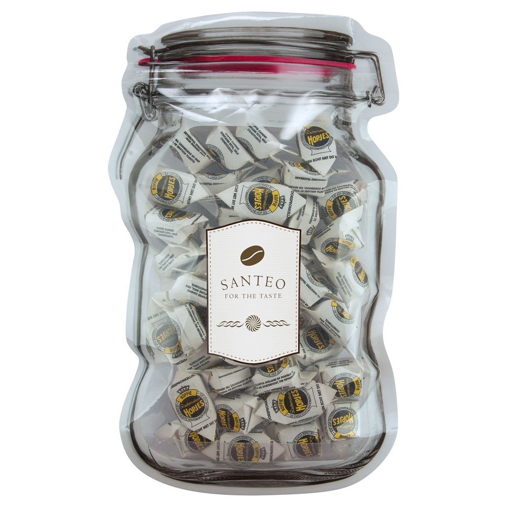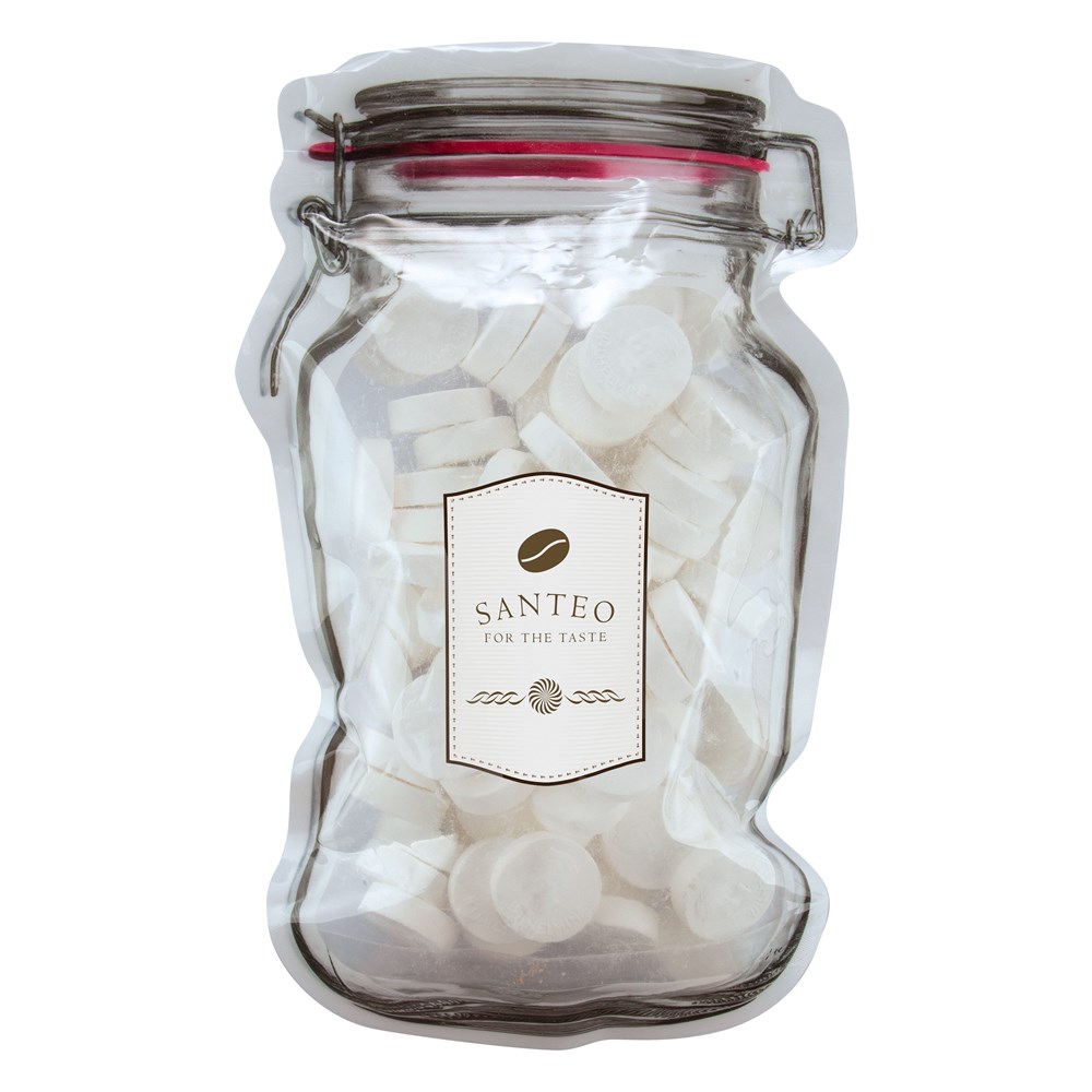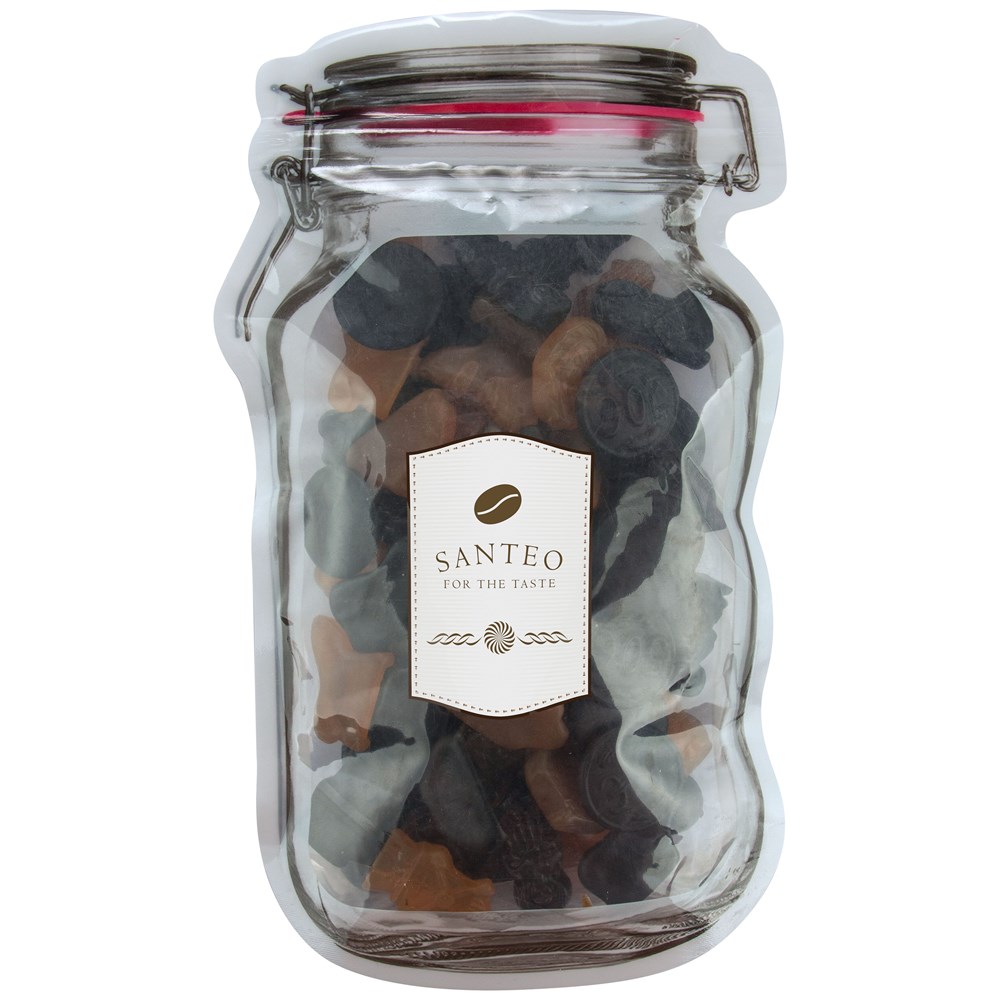 Mailing weckpot maxi gevuld met dropstaafjes en voorzien van een full colour sticker in eigen vorm