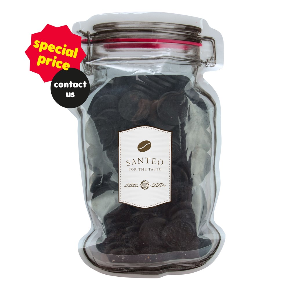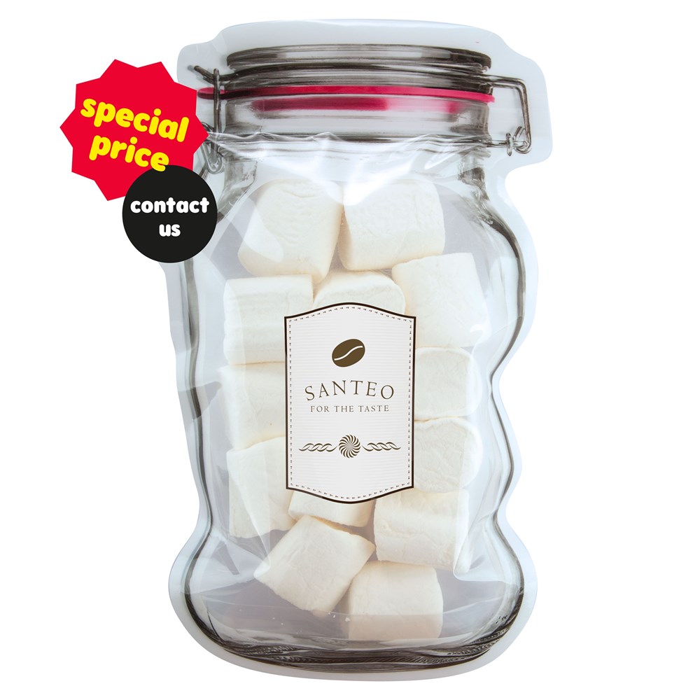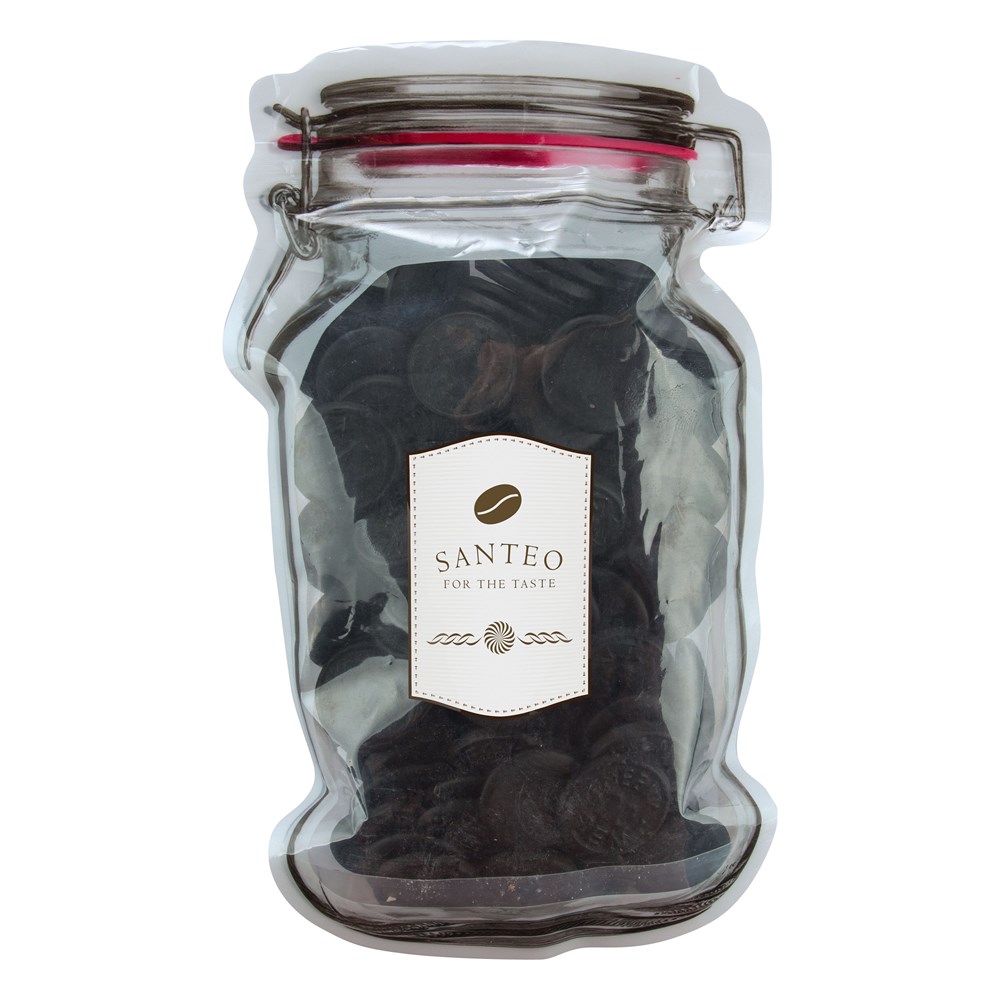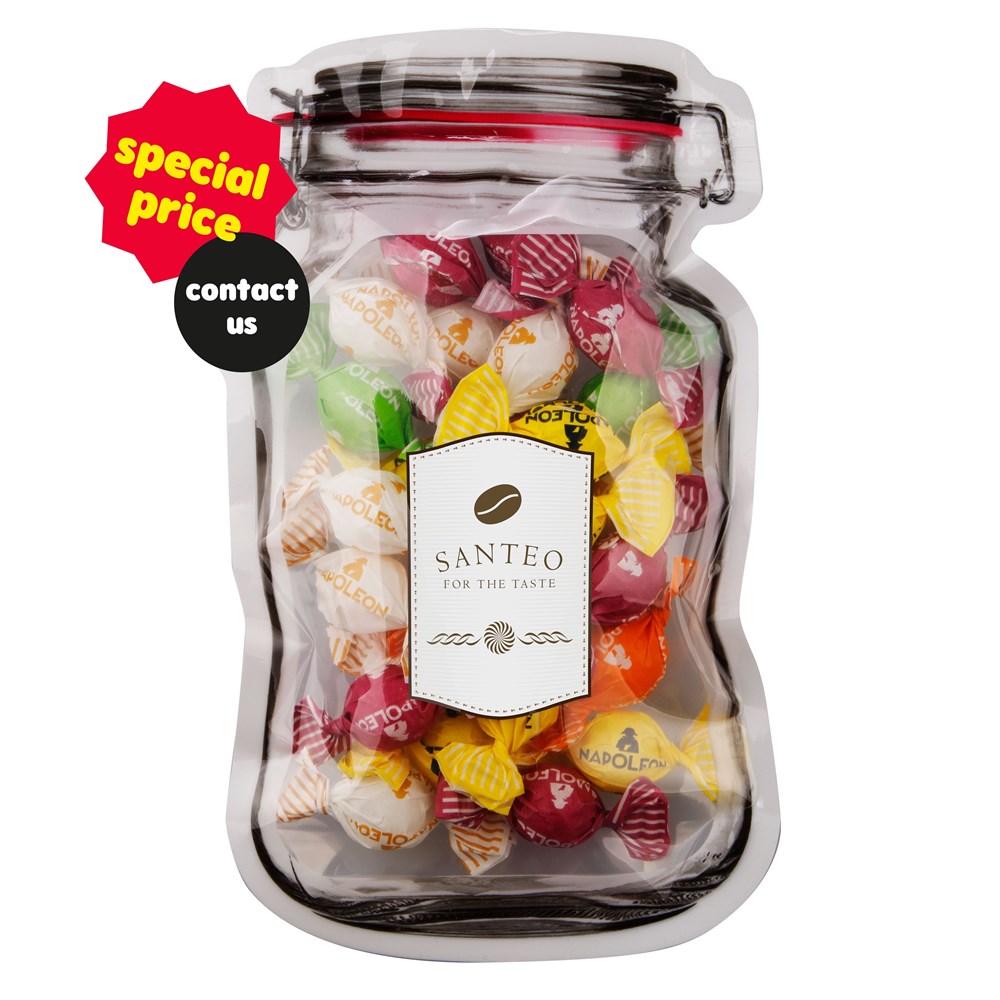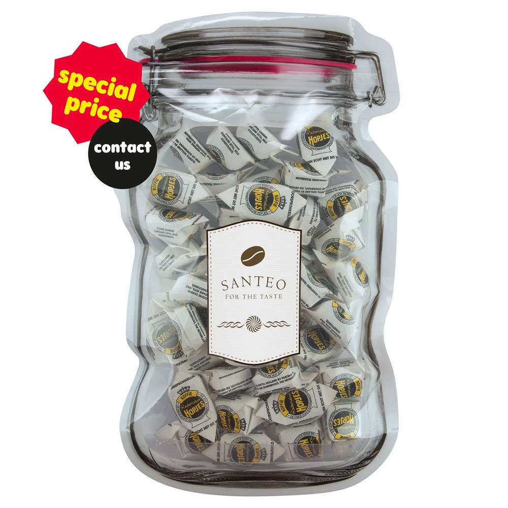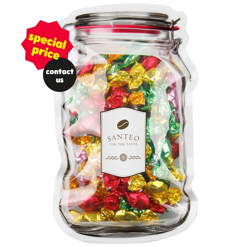 Mailing weckpot maxi gevuld met dropstaafjes en voorzien van een full colour sticker in eigen vorm