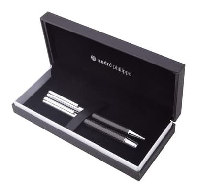 Elegante, metalen balpen- en rollerpenset, met carbonpatroon en glanzende chromen onderdelen. In zwarte geschenkdoos. Blauwschrijvend. André Philippe merkproduct.