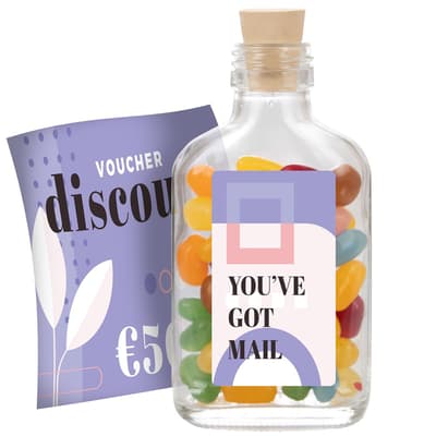 Glazen flesje voorzien van een full colour sticker op de voorzijde en een bedrukte (opgerolde) brief in het flesje, gevuld met ca. 75 gram jelly beans