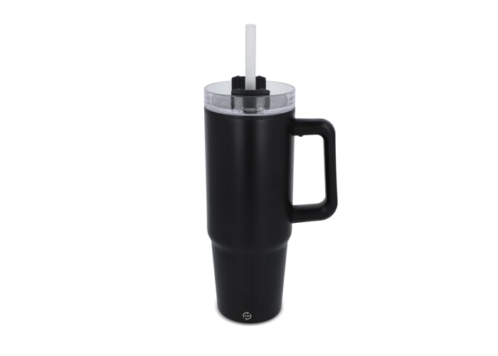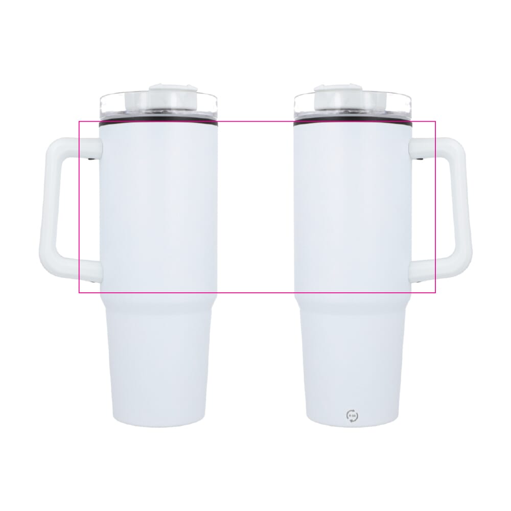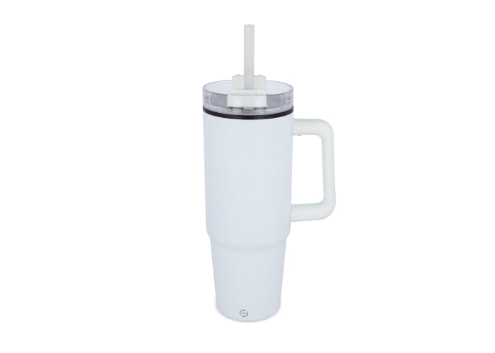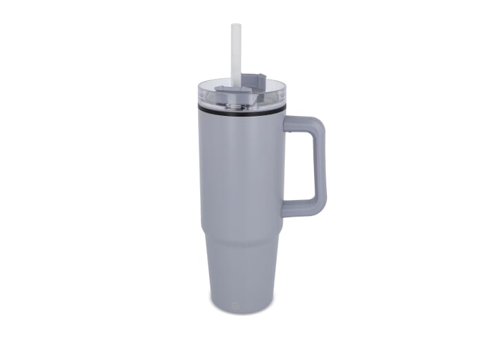 De Miami-mok is een trendy, geïsoleerde mok van 800 ml met een stijlvolle uitstraling gemaakt van roestvrij staal met een interieur van gerecycled plastic. Hij heeft een smalle bodem die in de meeste auto-bekerhouders past, en een handvat en rietje om de hele dag door te hydrateren. De GRS-certificering garandeert een volledig gecertificeerde toeleveringsketen van het gerecyclede materiaal.