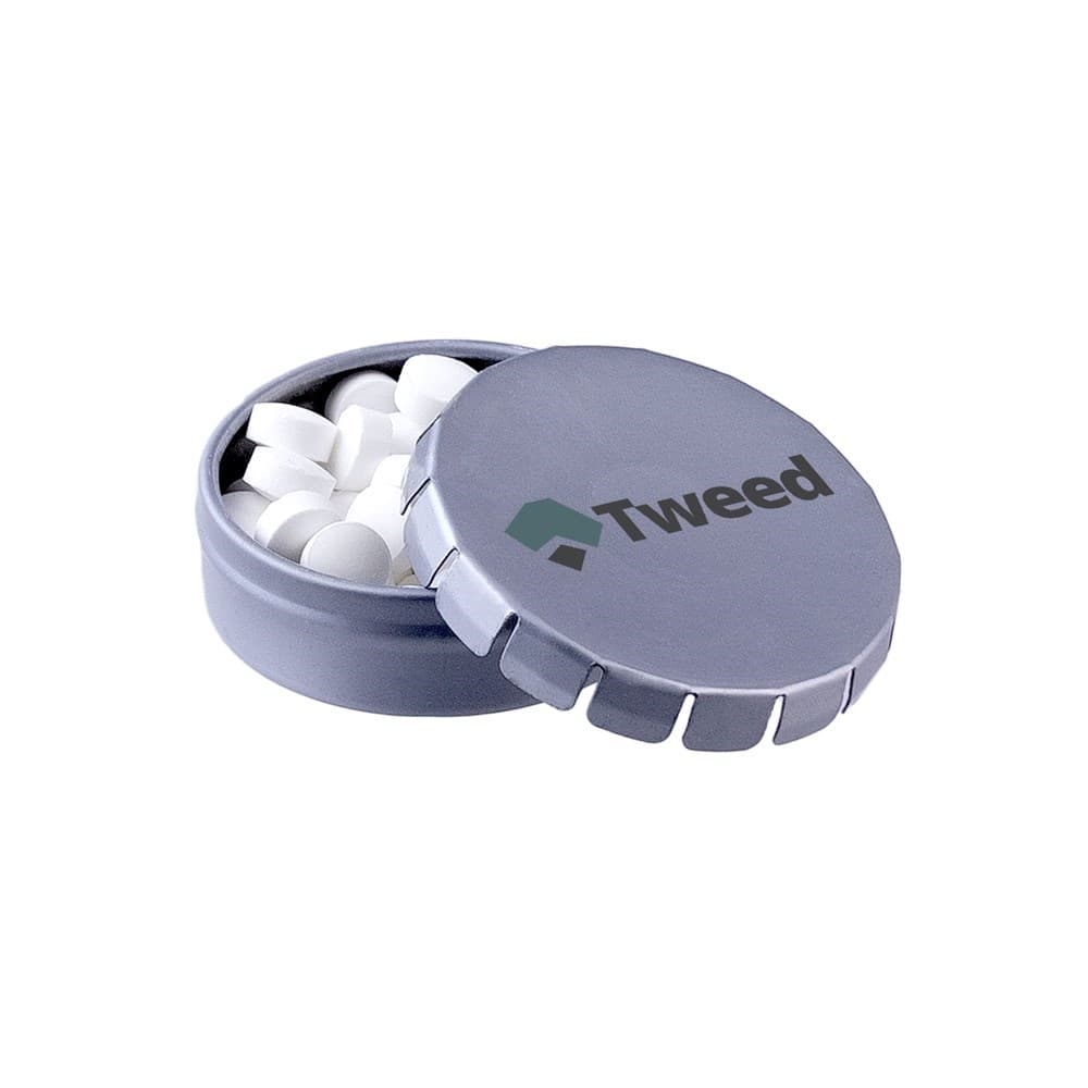 Micro clic-clac blikje zilver met ca. 5 gram pepermunt, voorzien van een full colour bedrukking. Inclusief ingrediëntensticker en seal.
