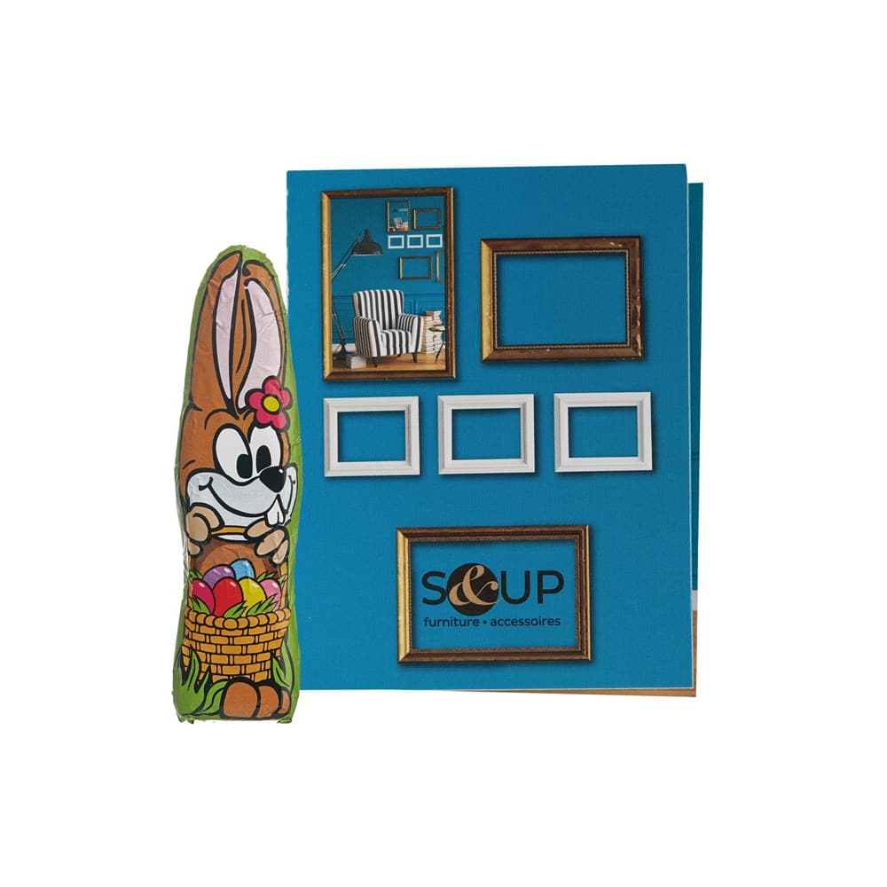 Bedrukte sweetcard met standaard mini chocolade paashaasje ca. 6 gram in aluminiumfolie folie. De achterzijde is onbedrukt. Perfect als paasgeschenk.
