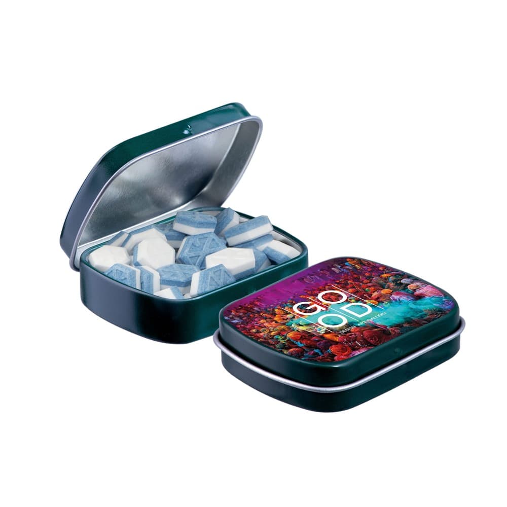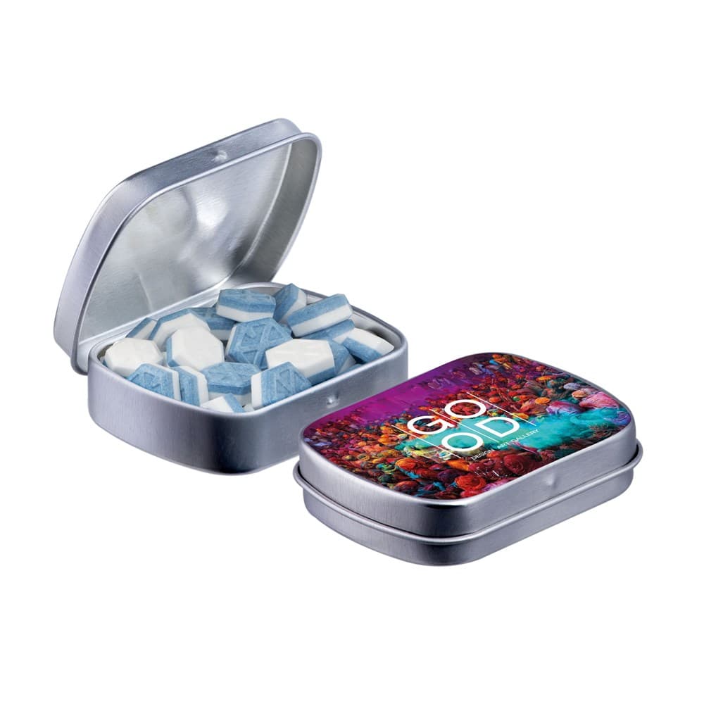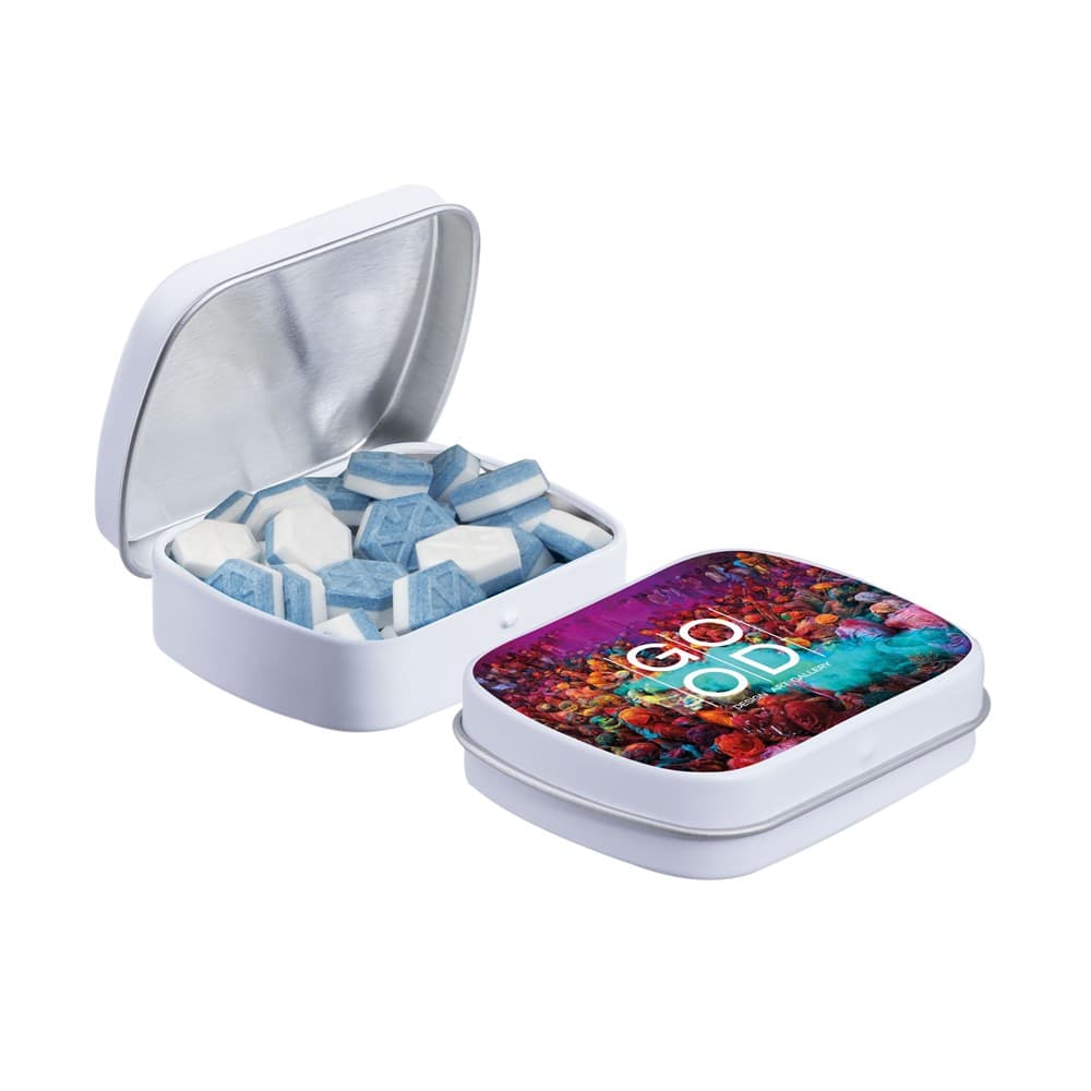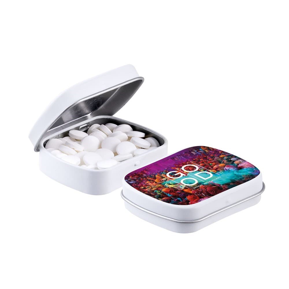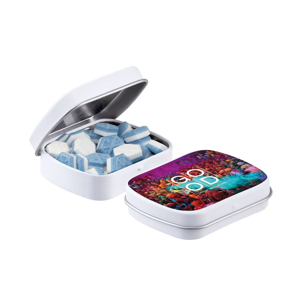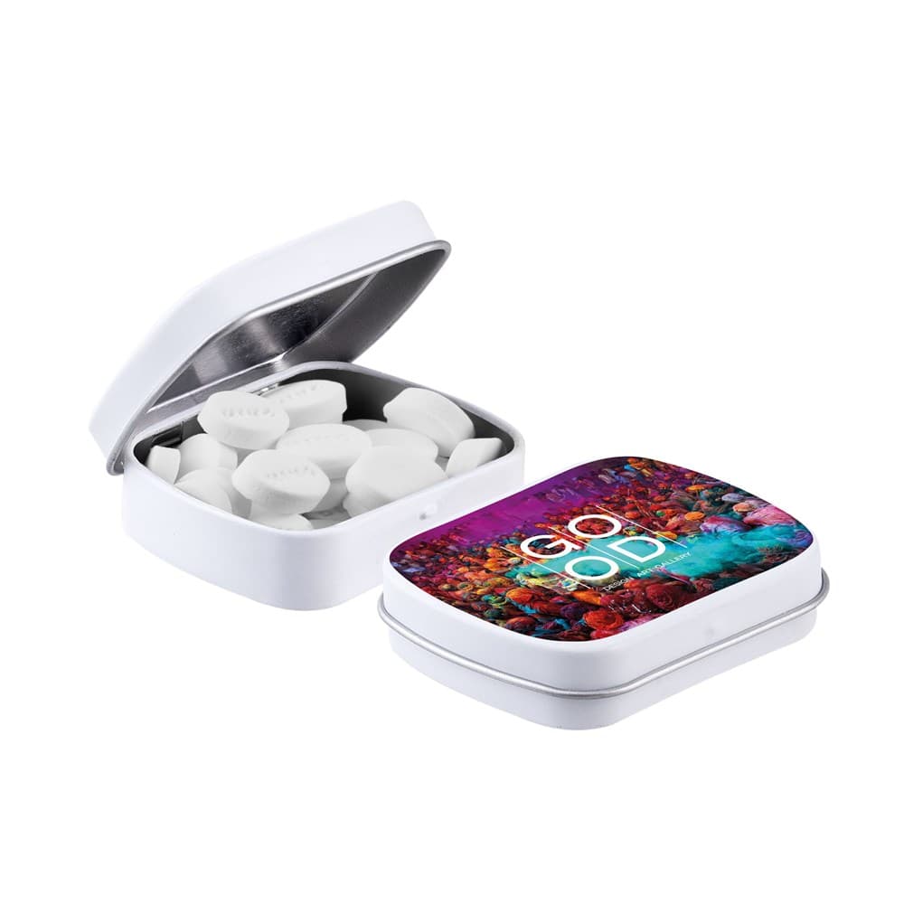 Mini scharnierblikje wit met ca. 23 gram pepermunt en voorzien van een full colour bedrukking. Inclusief ingrediëntensticker en seal.