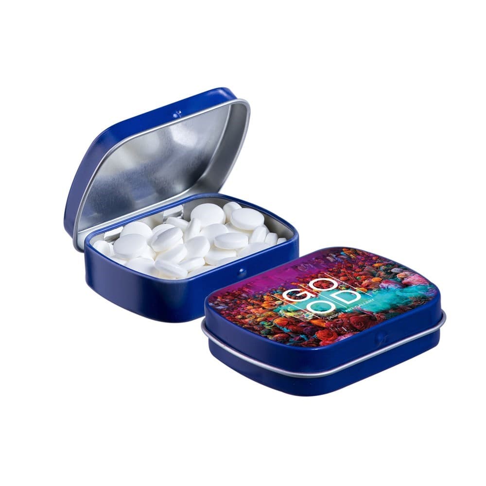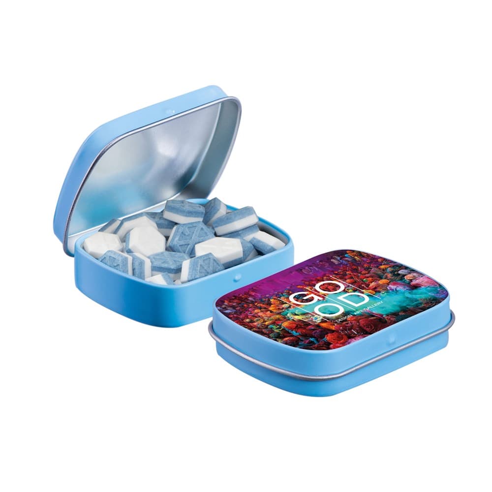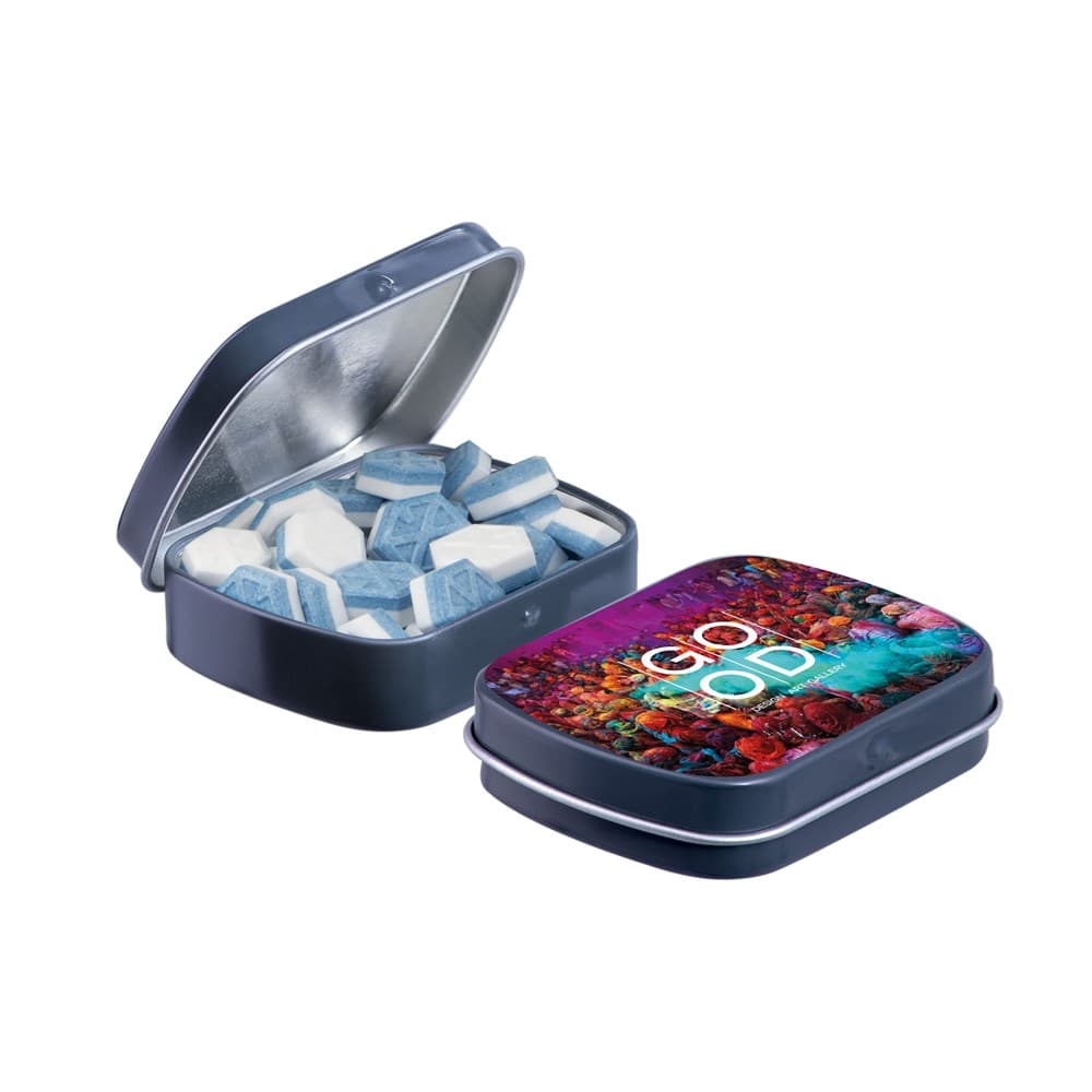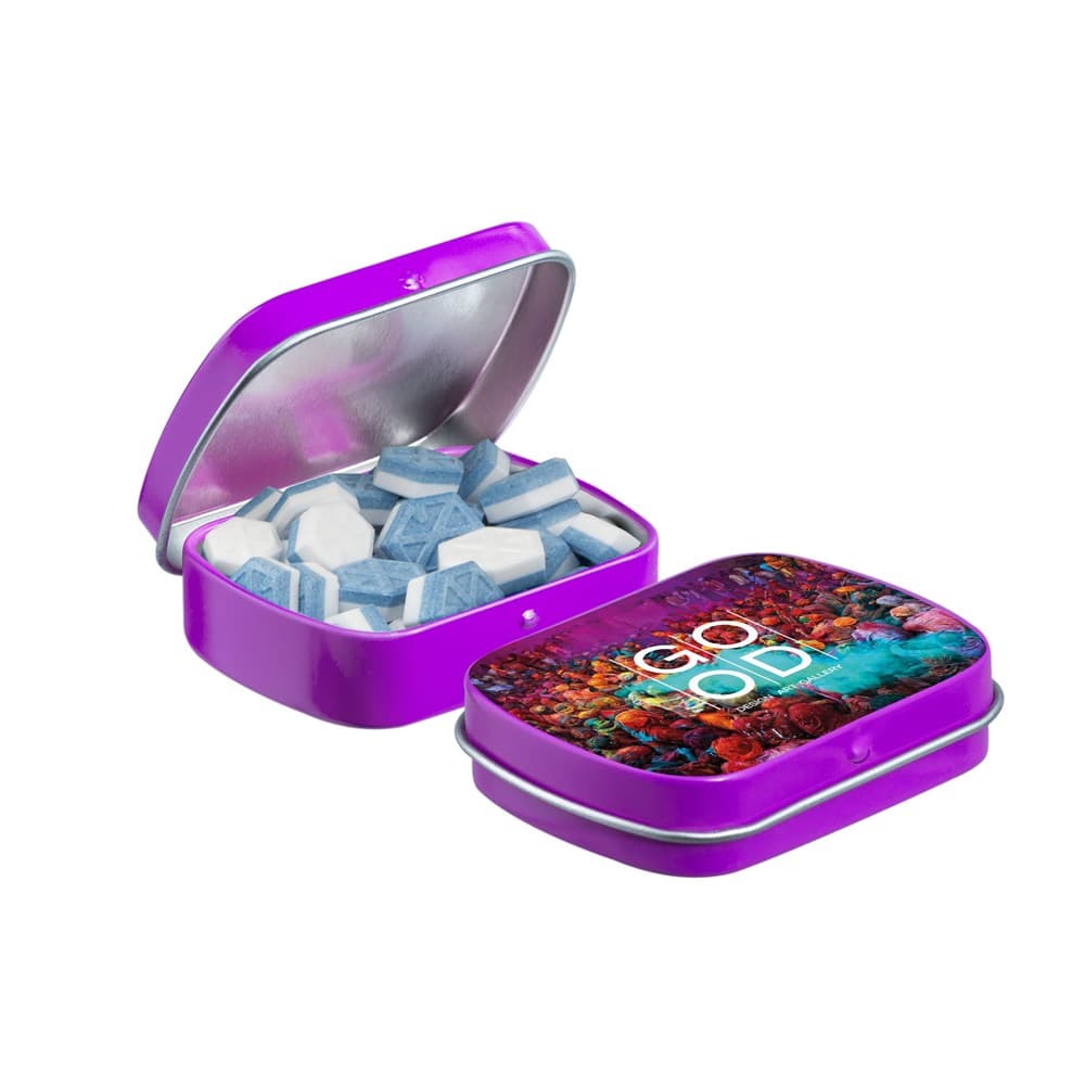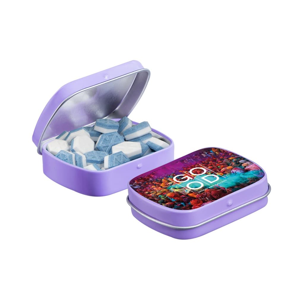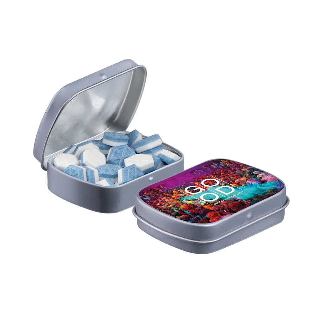 Mini scharnierblikje wit met ca. 23 gram pepermunt en voorzien van een full colour bedrukking. Inclusief ingrediëntensticker en seal.