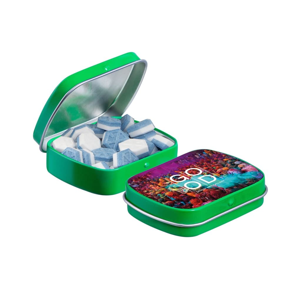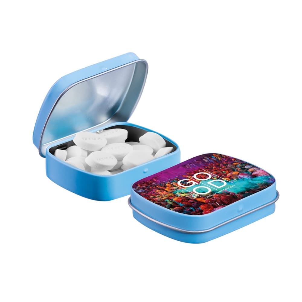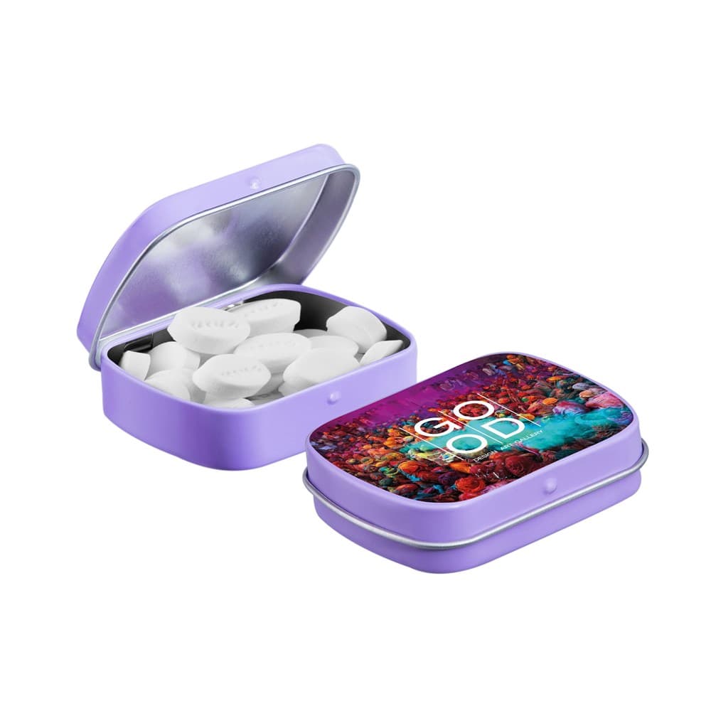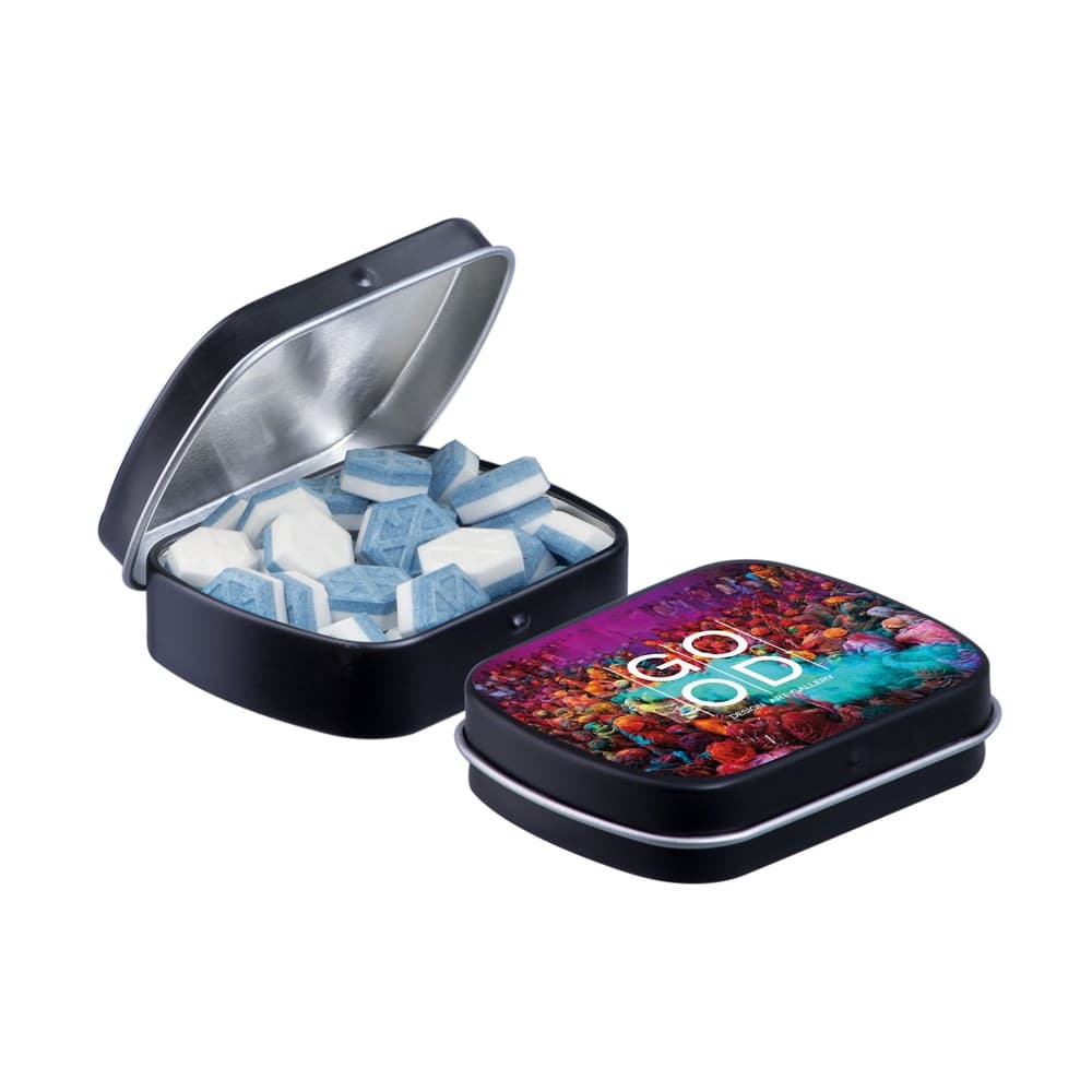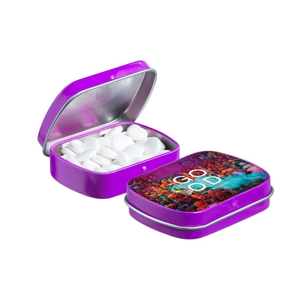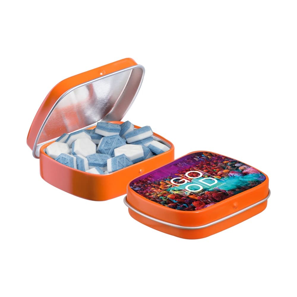 Mini scharnierblikje wit met ca. 23 gram pepermunt en voorzien van een full colour bedrukking. Inclusief ingrediëntensticker en seal.