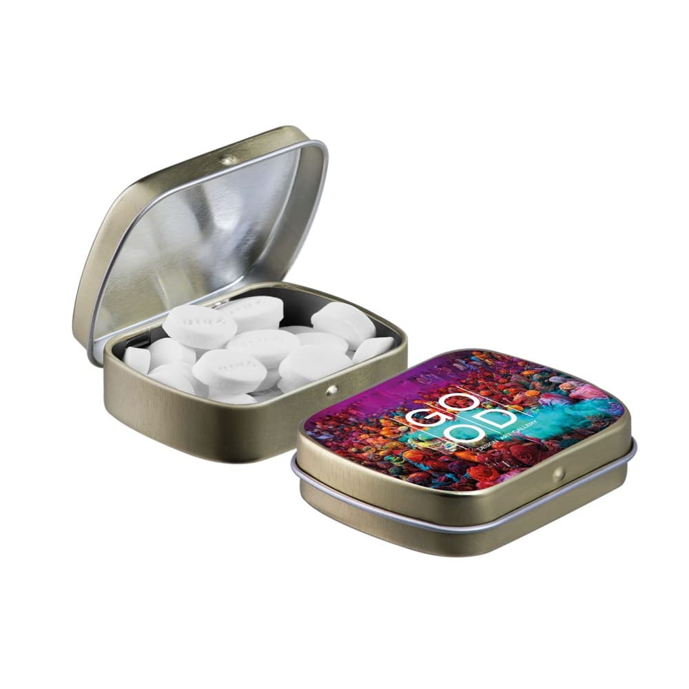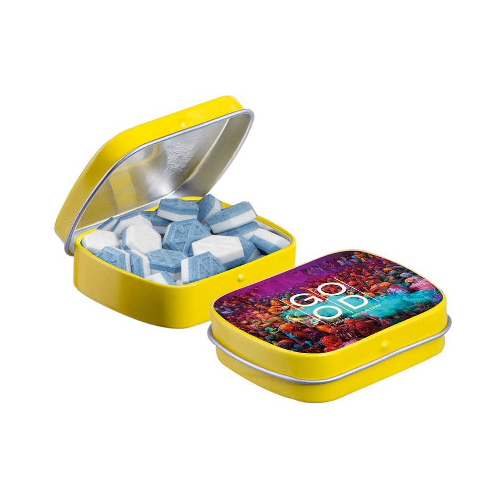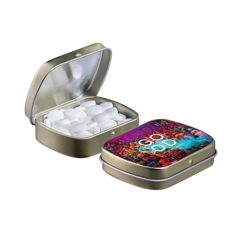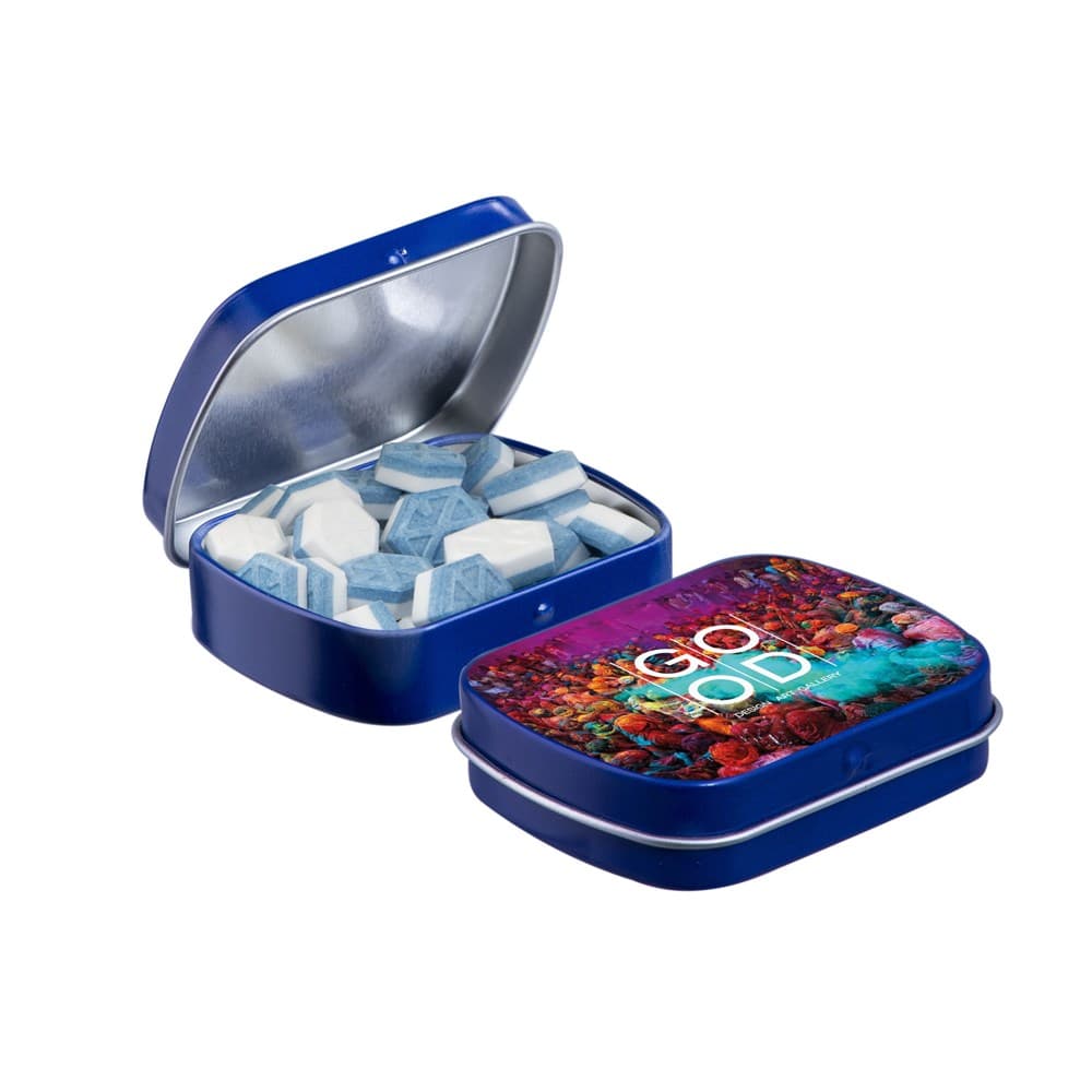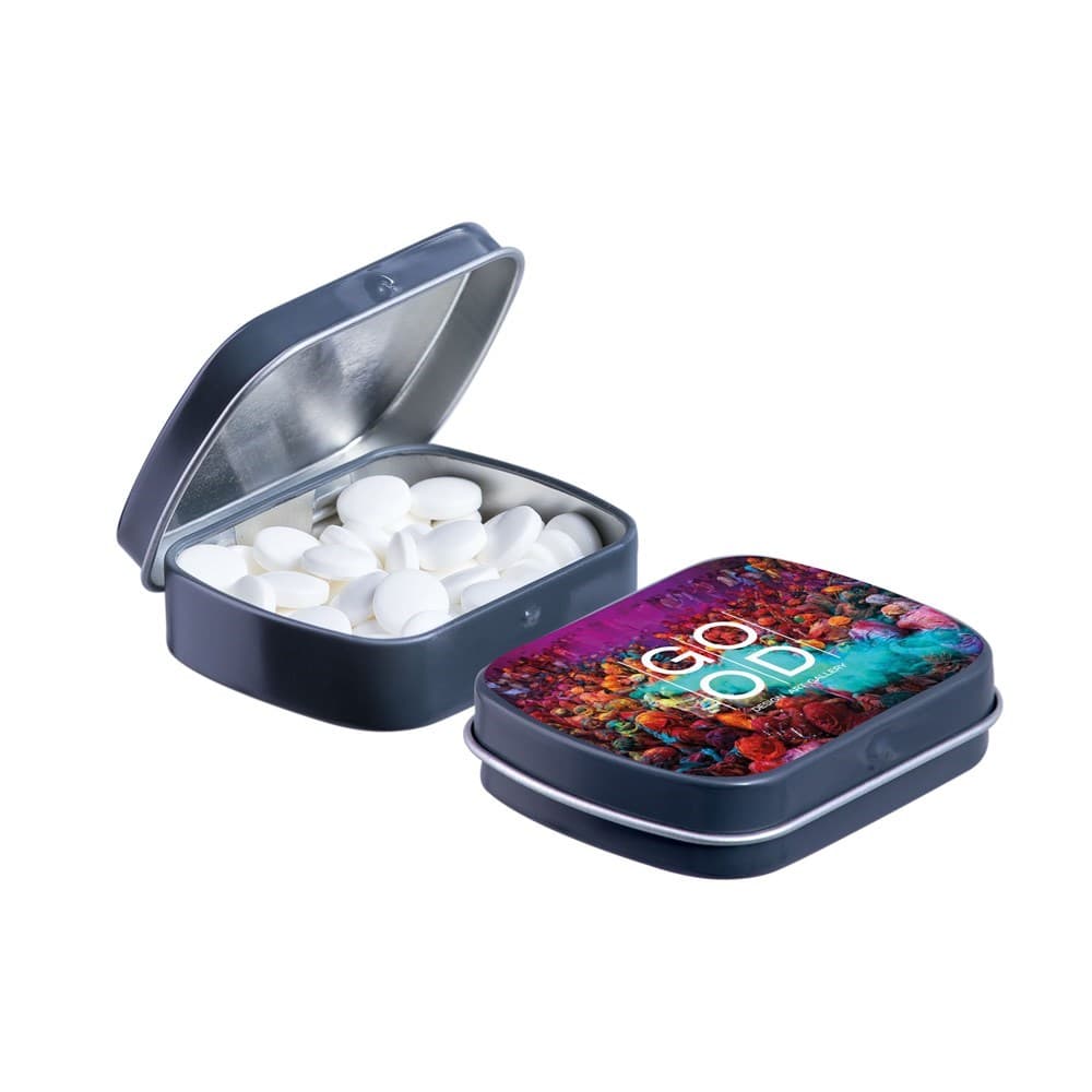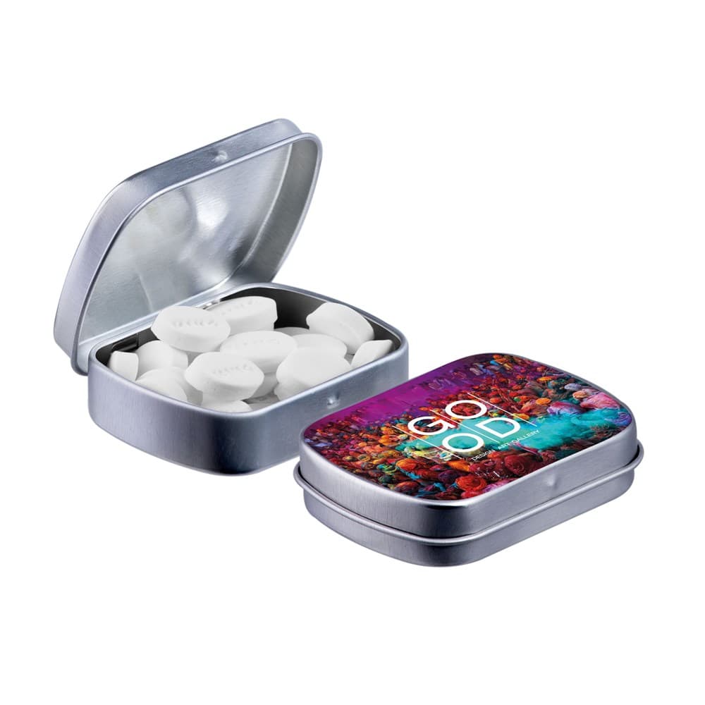 Mini scharnierblikje wit met ca. 23 gram pepermunt en voorzien van een full colour bedrukking. Inclusief ingrediëntensticker en seal.