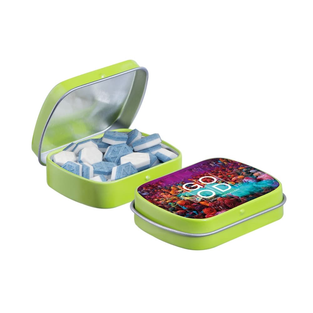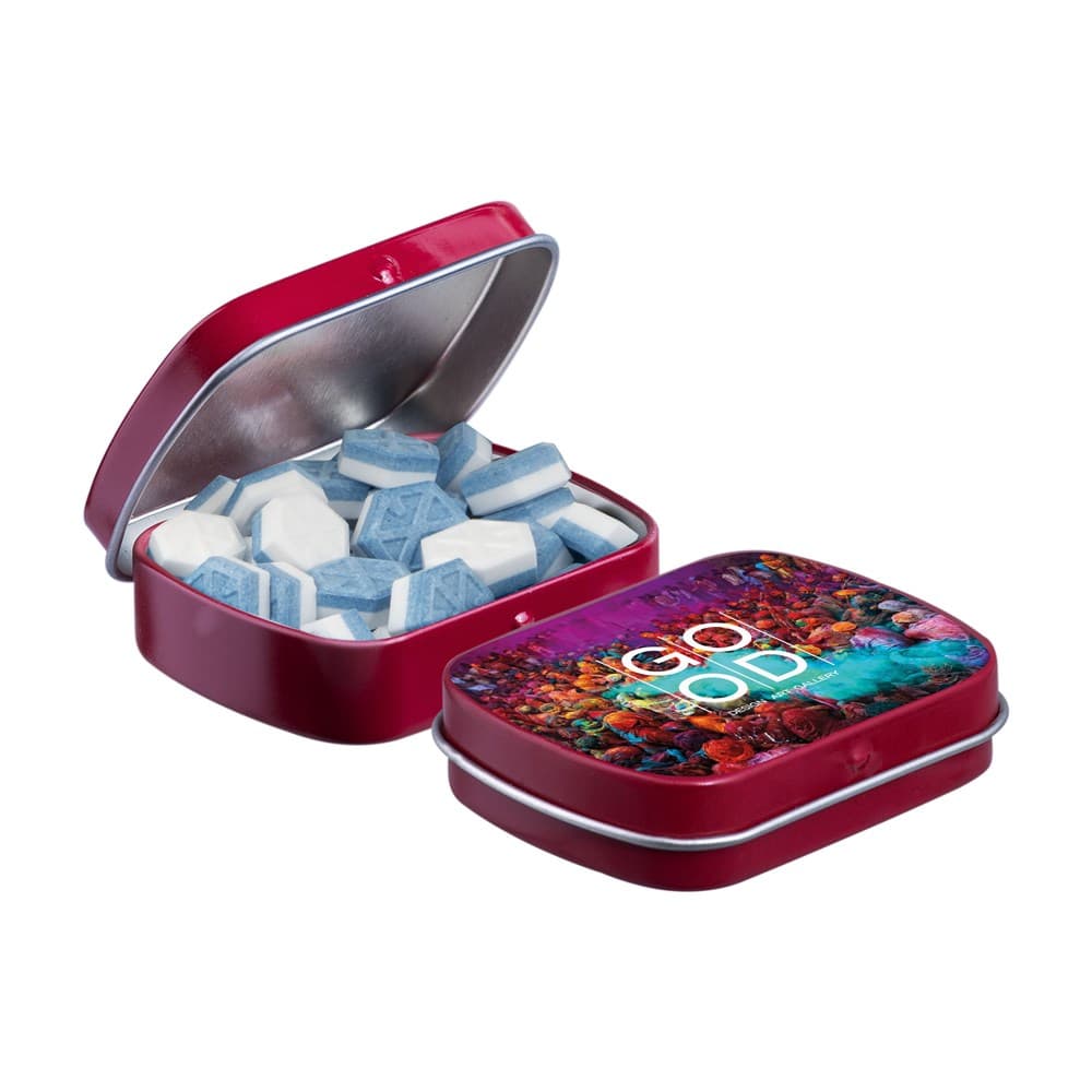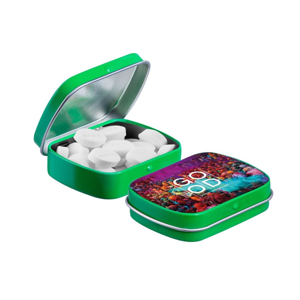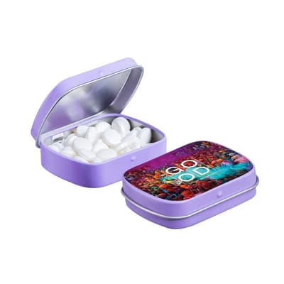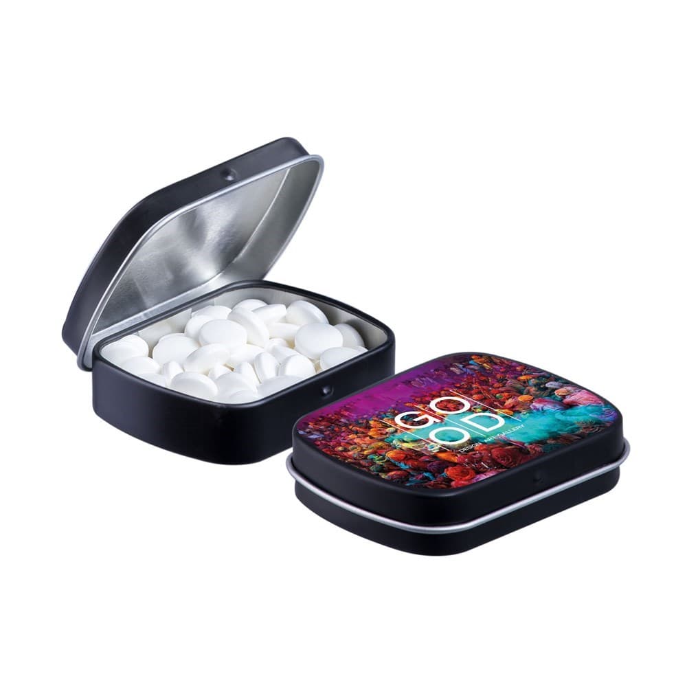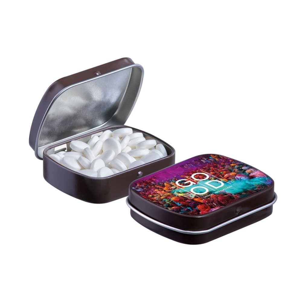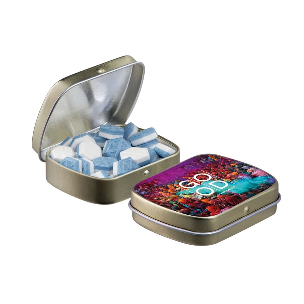 Mini scharnierblikje wit met ca. 23 gram pepermunt en voorzien van een full colour bedrukking. Inclusief ingrediëntensticker en seal.
