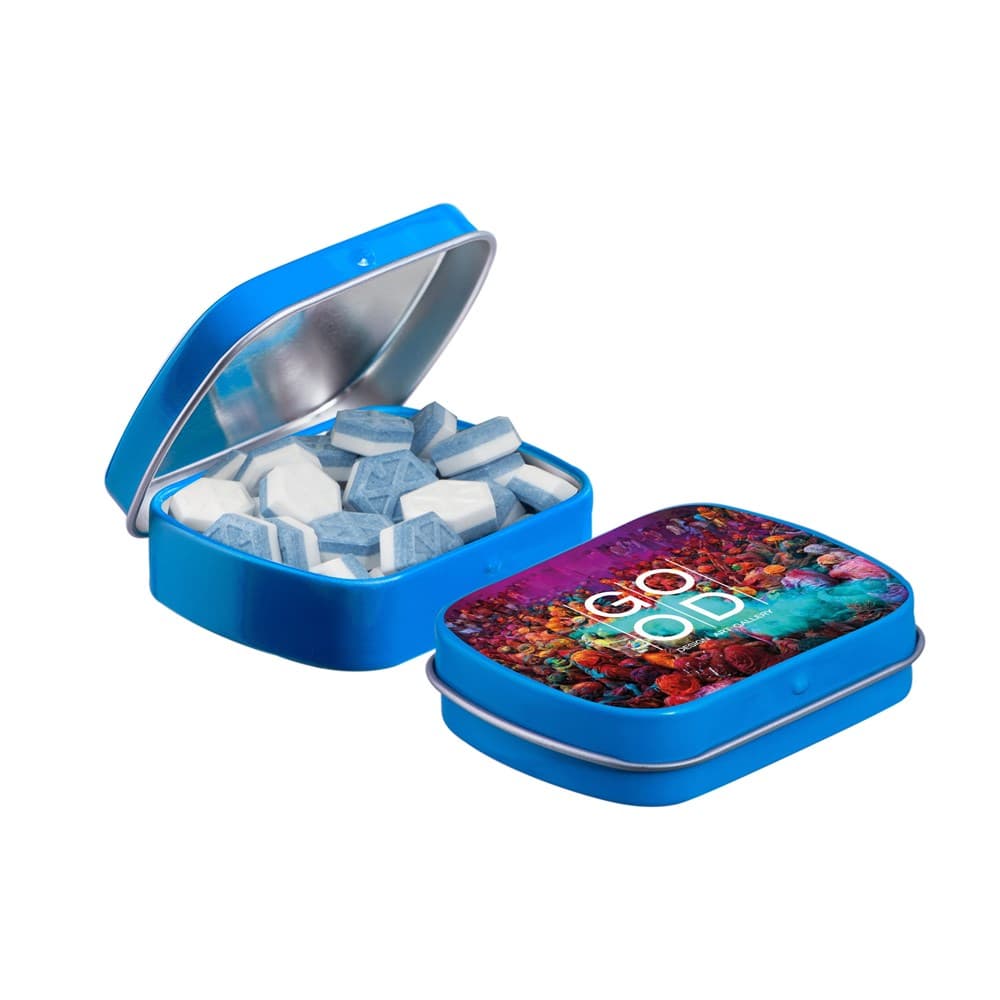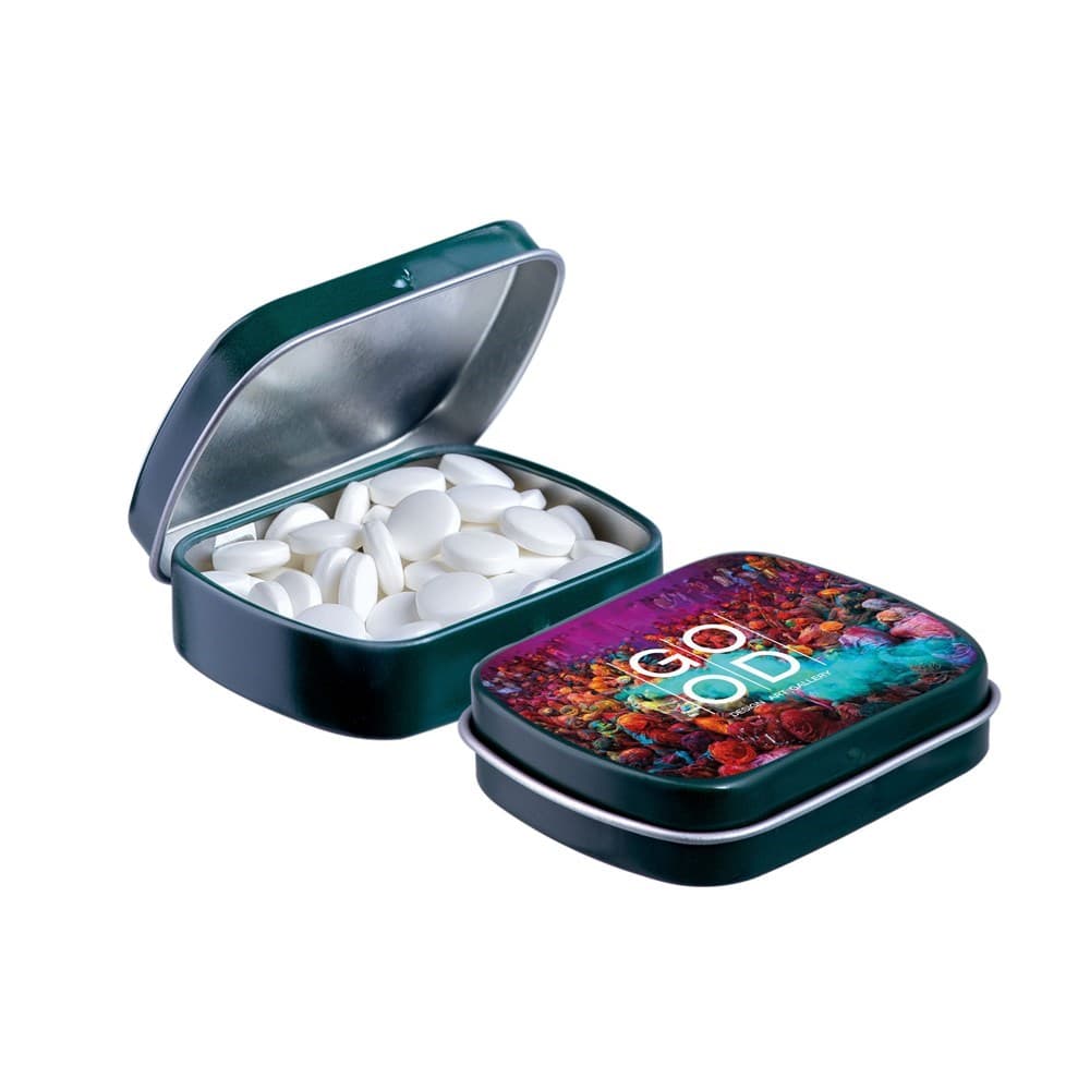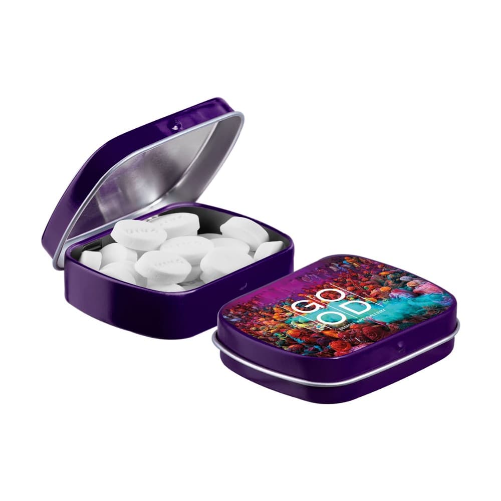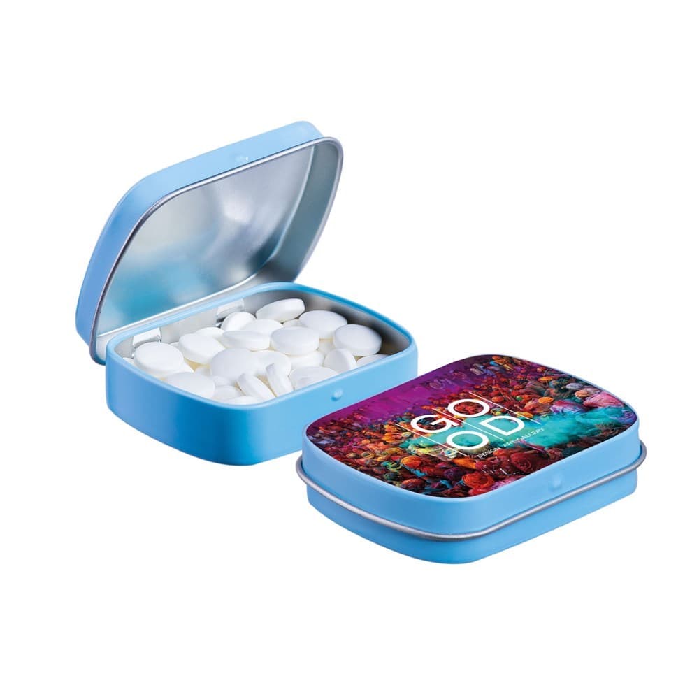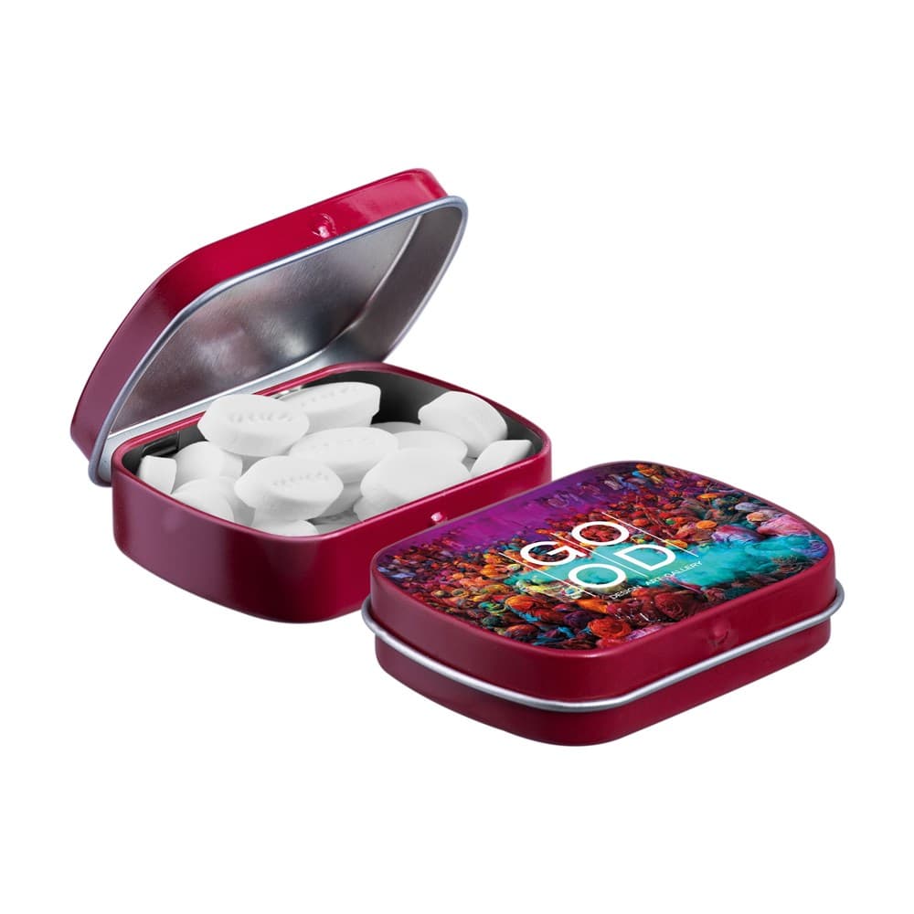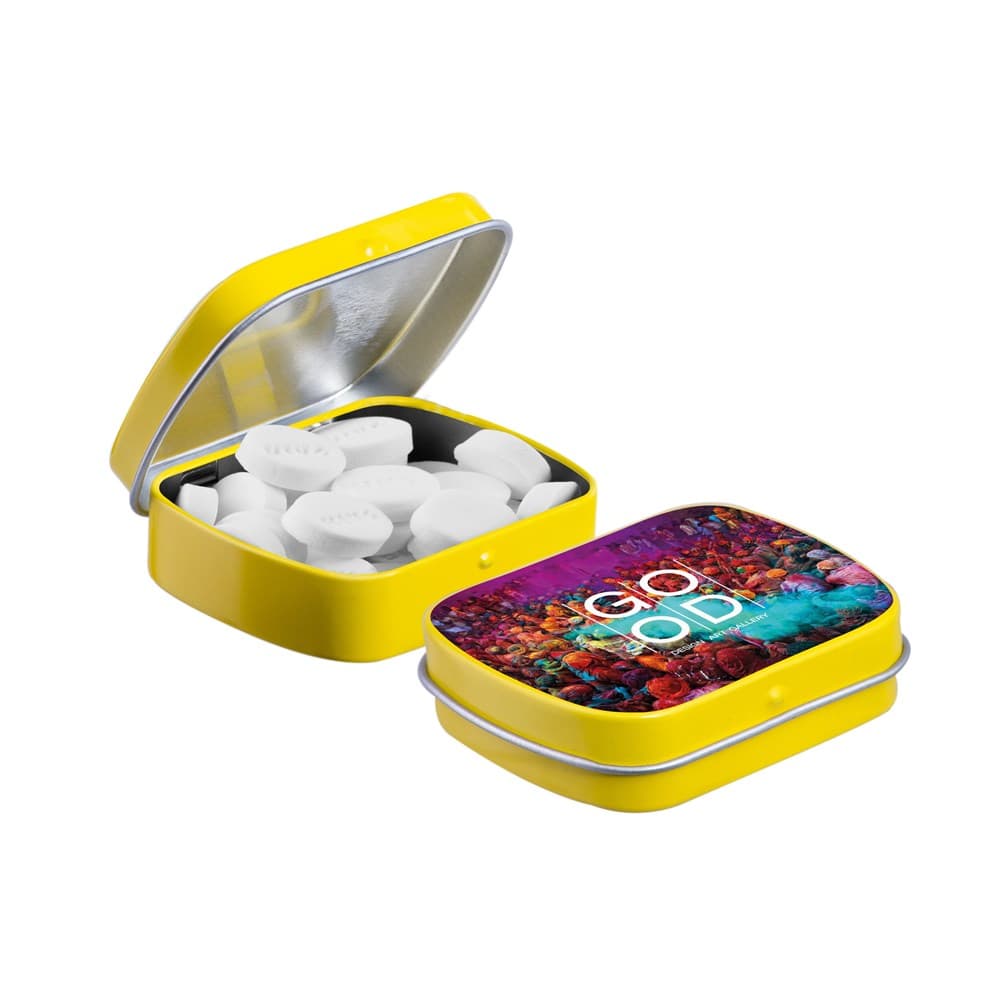 Mini scharnierblikje wit met ca. 23 gram pepermunt en voorzien van een full colour bedrukking. Inclusief ingrediëntensticker en seal.