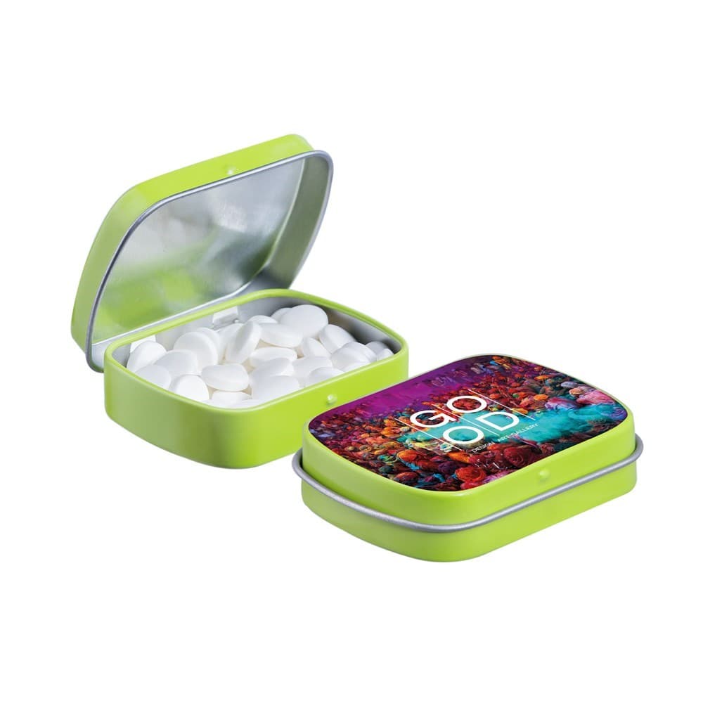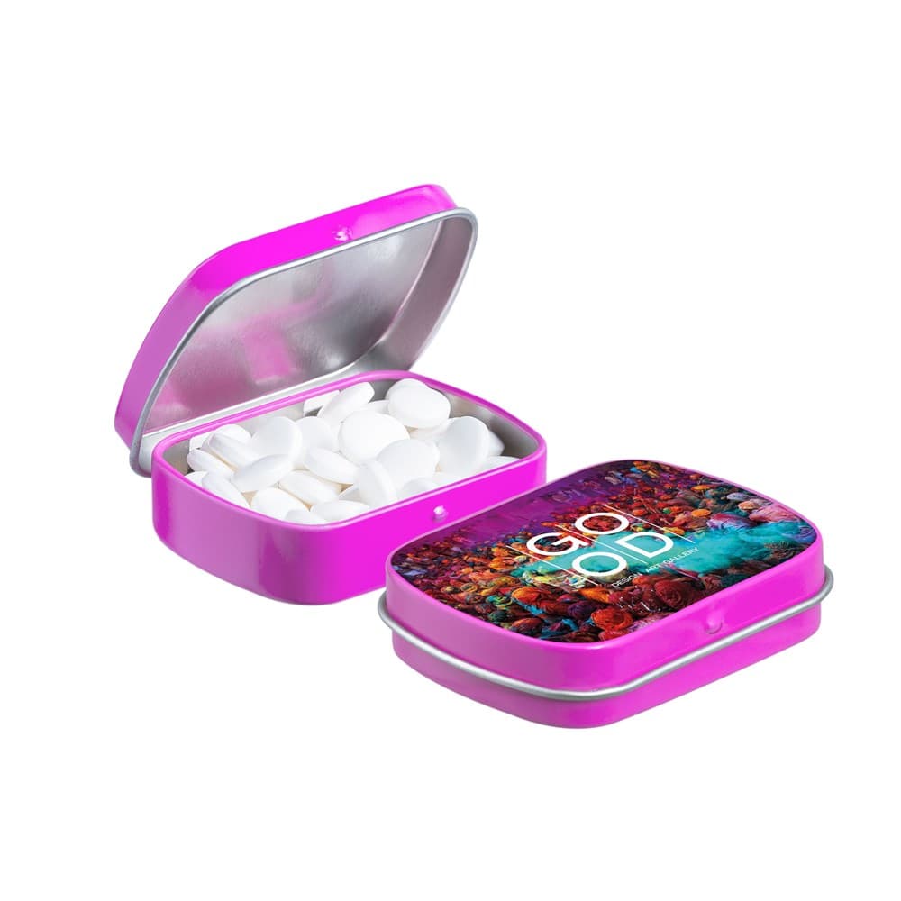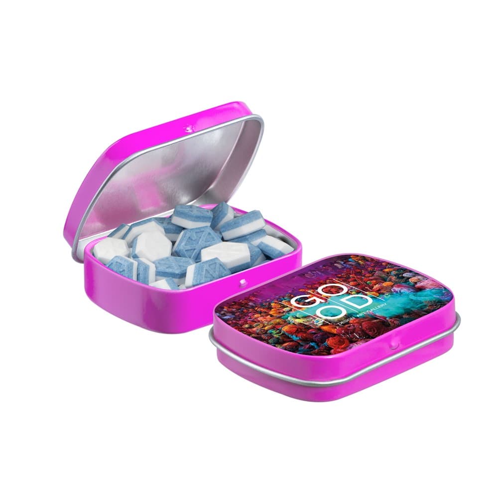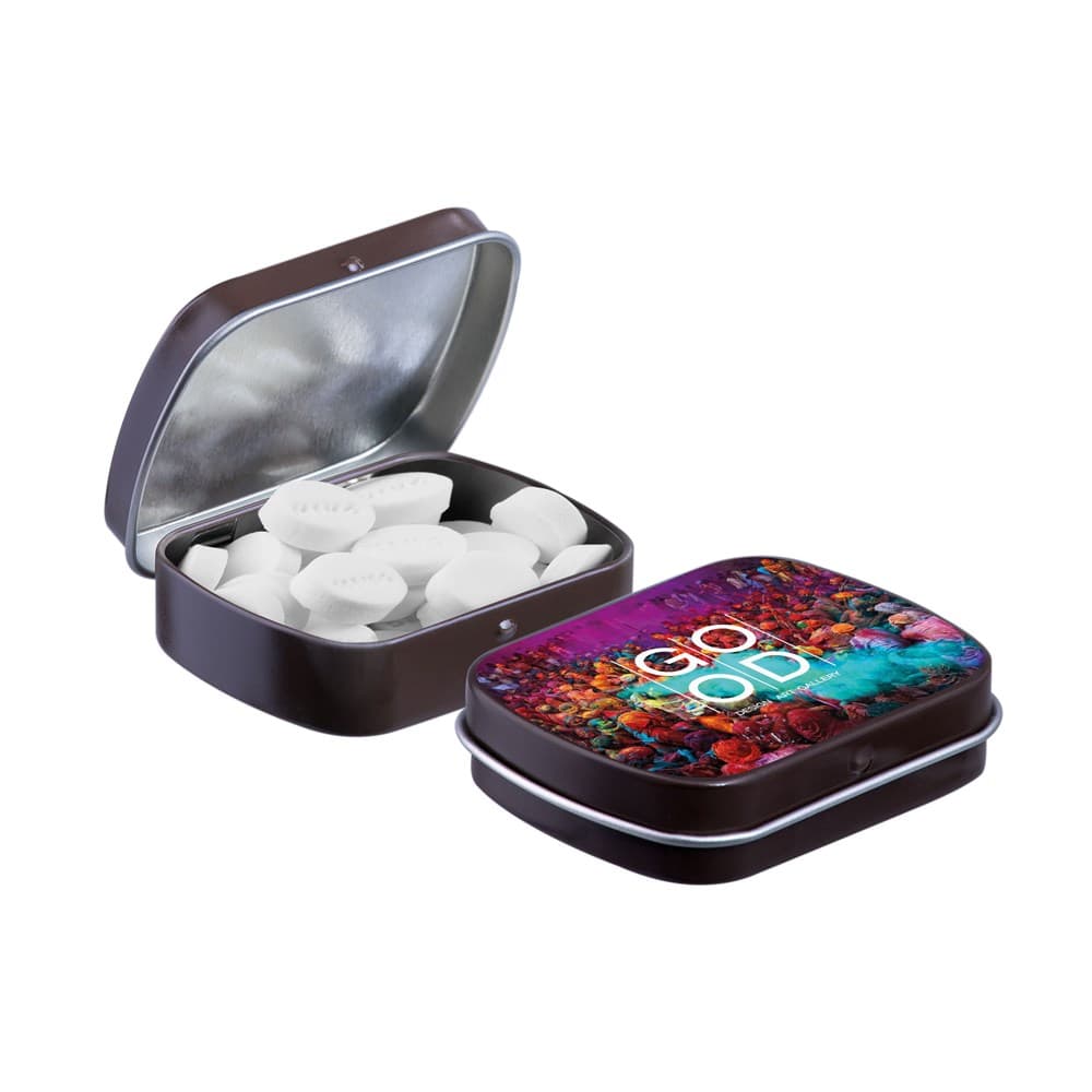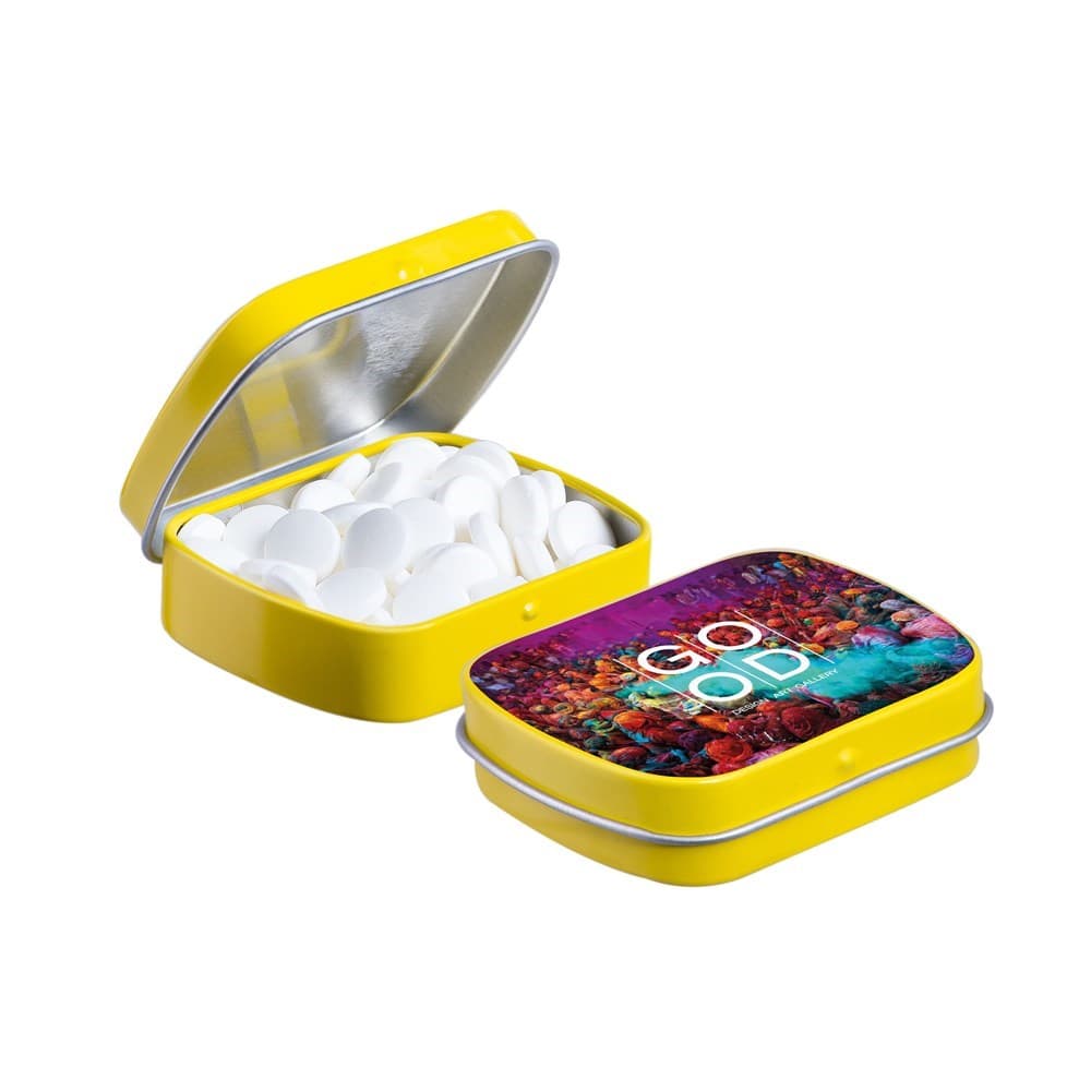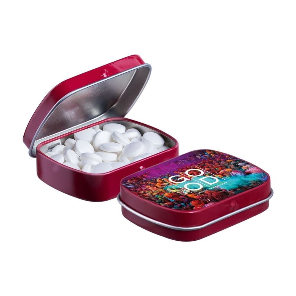 Mini scharnierblikje wit met ca. 23 gram pepermunt en voorzien van een full colour bedrukking. Inclusief ingrediëntensticker en seal.