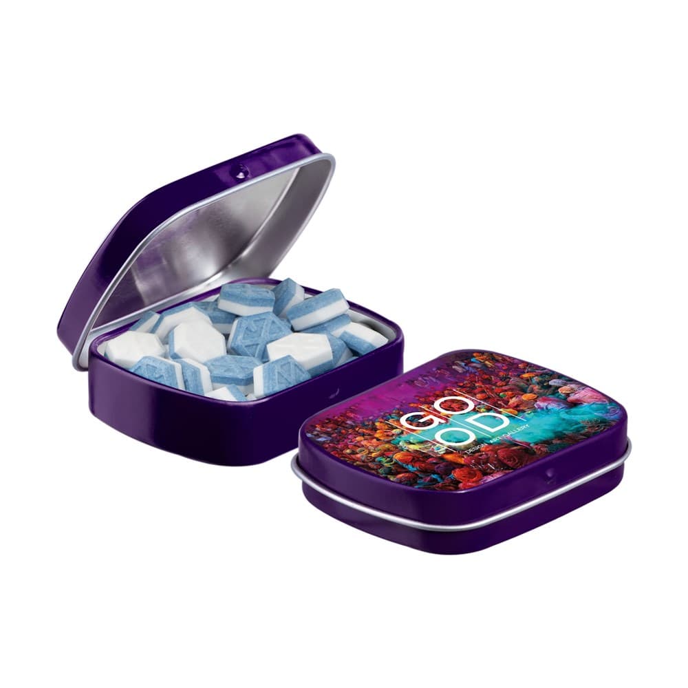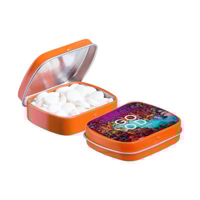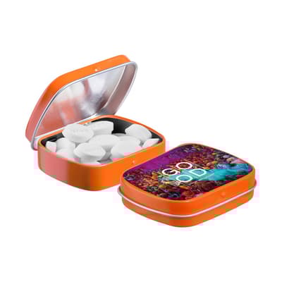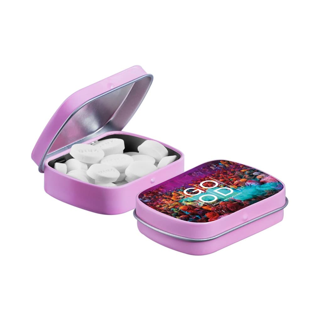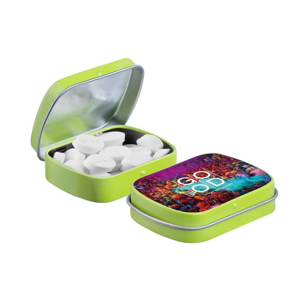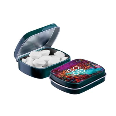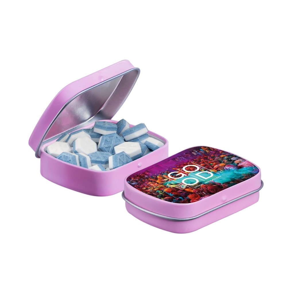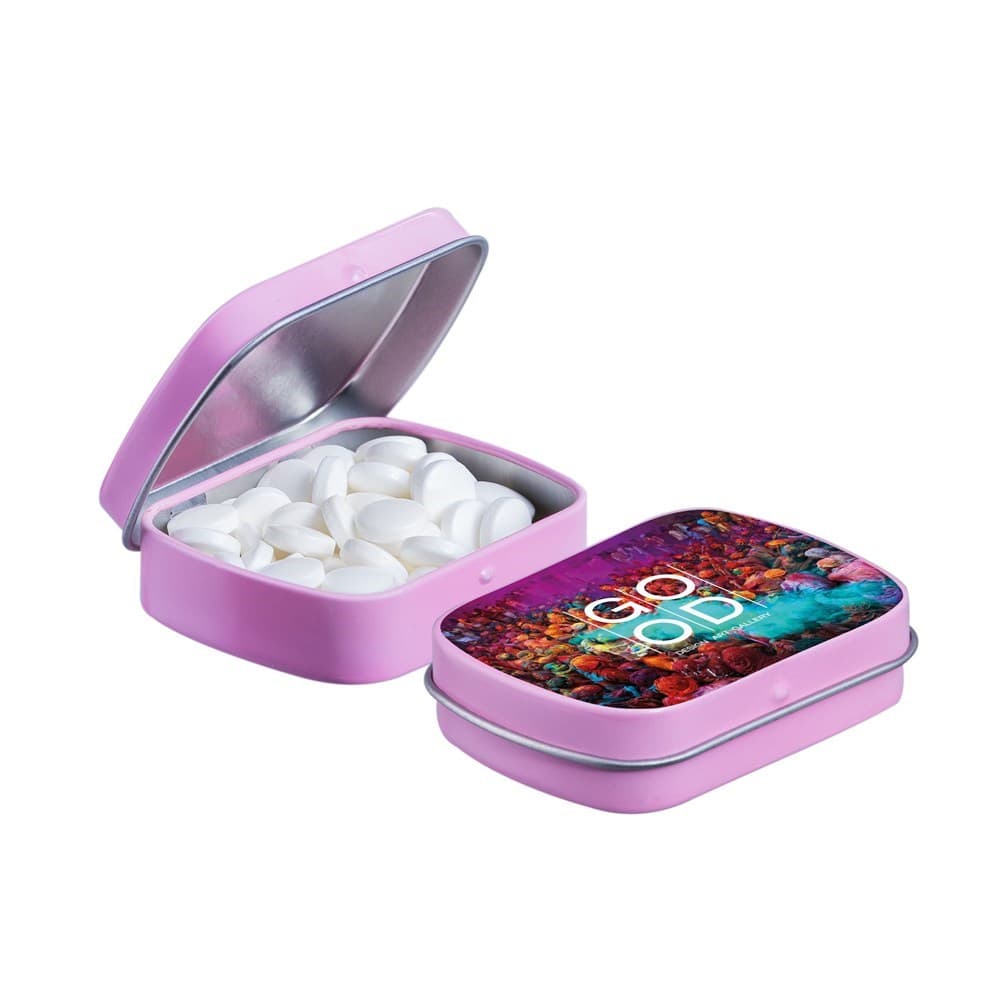 Mini scharnierblikje wit met ca. 23 gram pepermunt en voorzien van een full colour bedrukking. Inclusief ingrediëntensticker en seal.