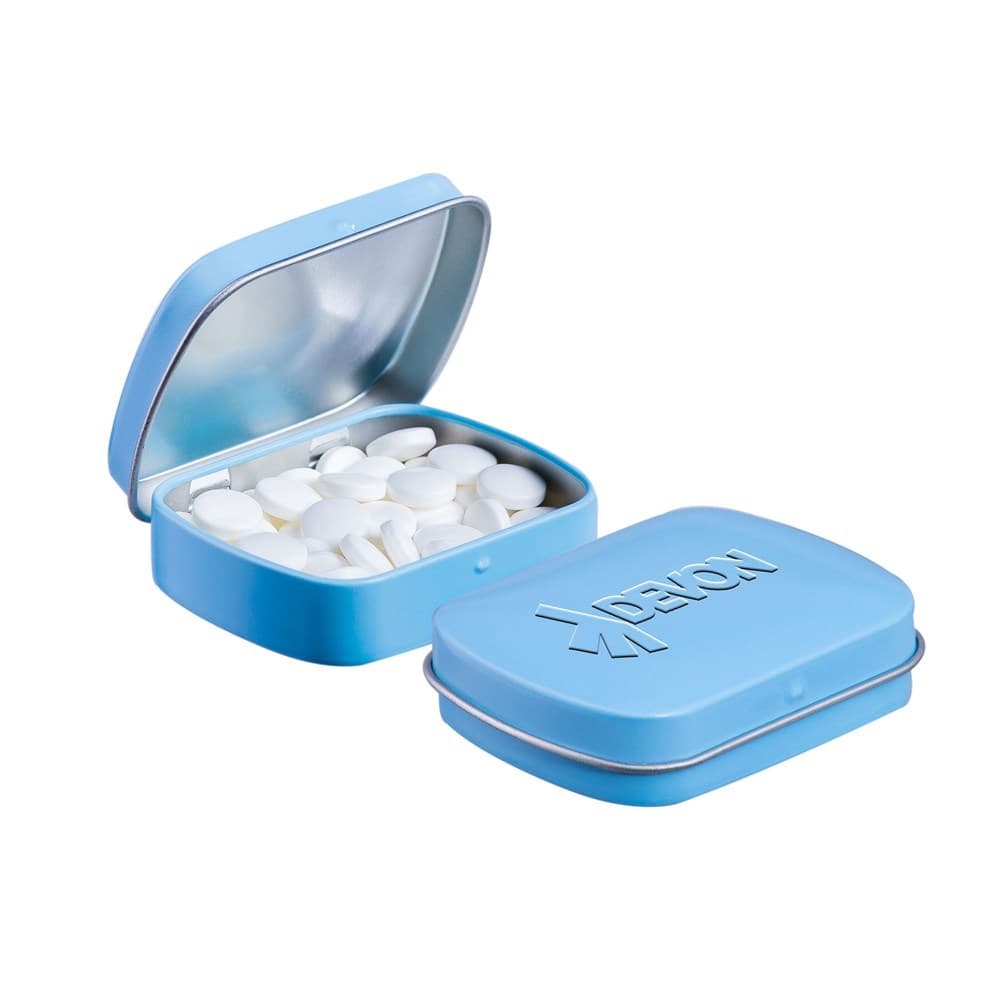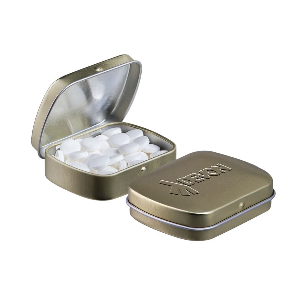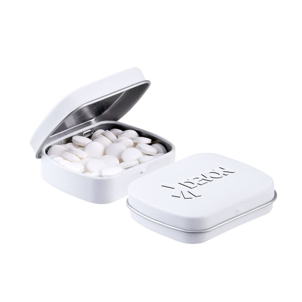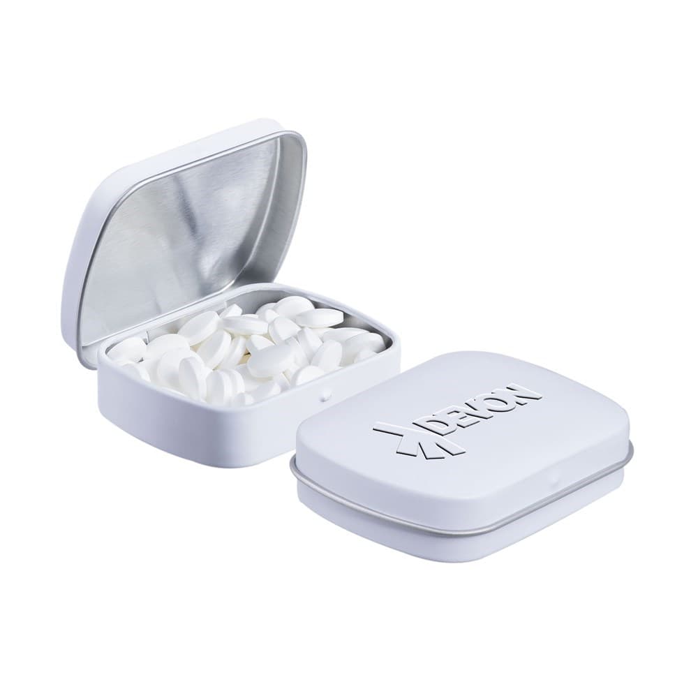 Mini scharnierblikje wit met ca. 23 gram pepermunt en voorzien van embossing. Inclusief ingrediëntensticker en seal (eenmalige malkosten 395,-)