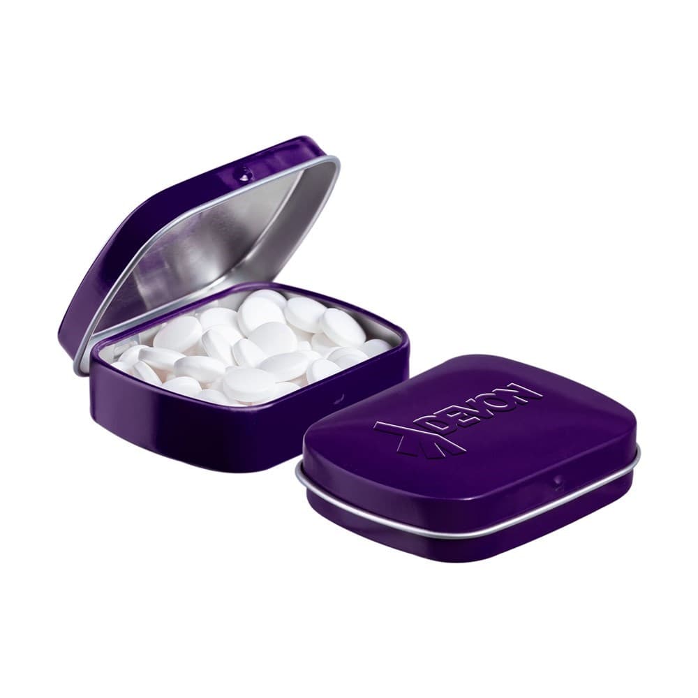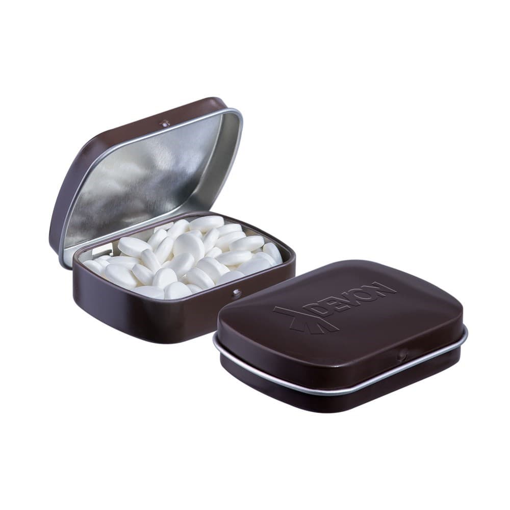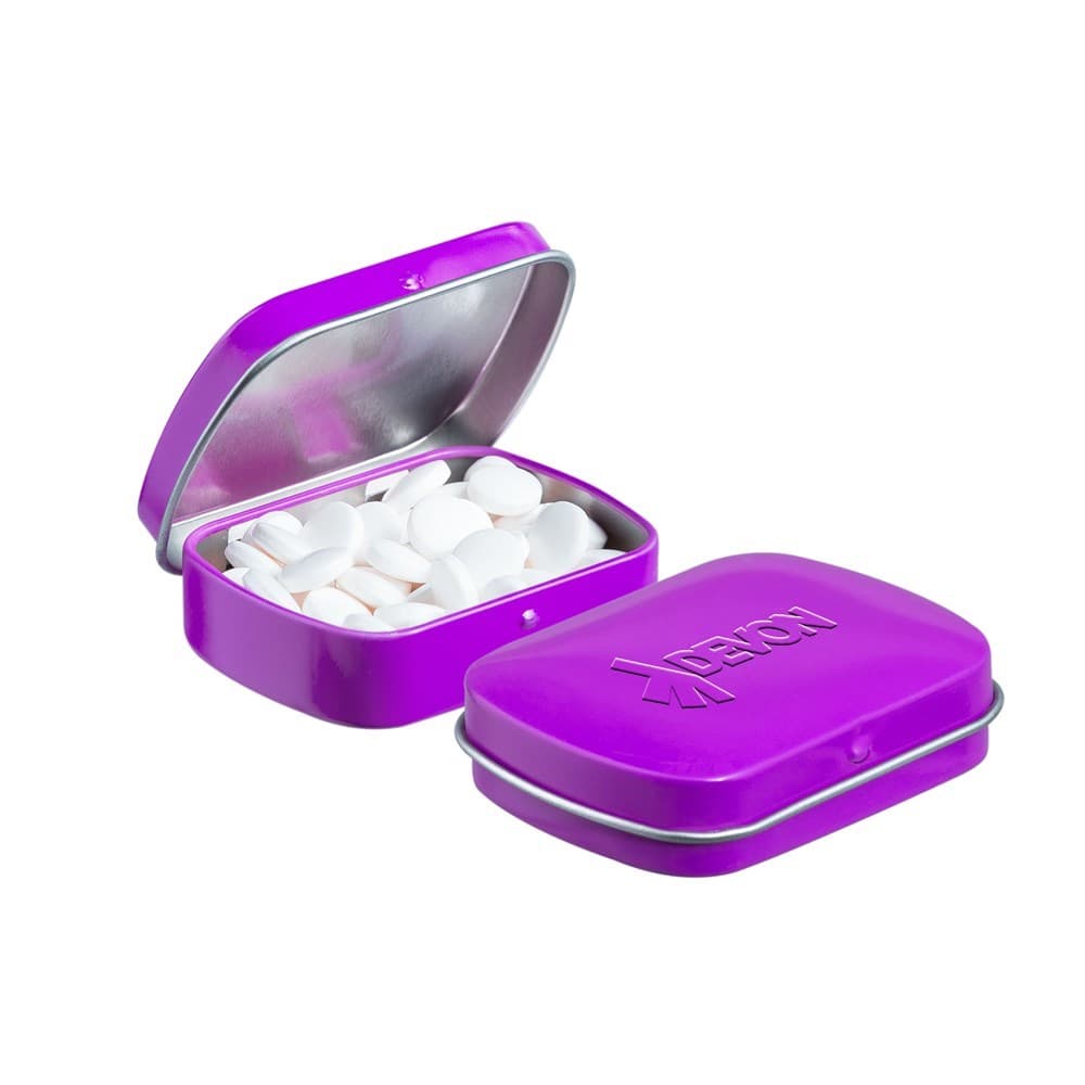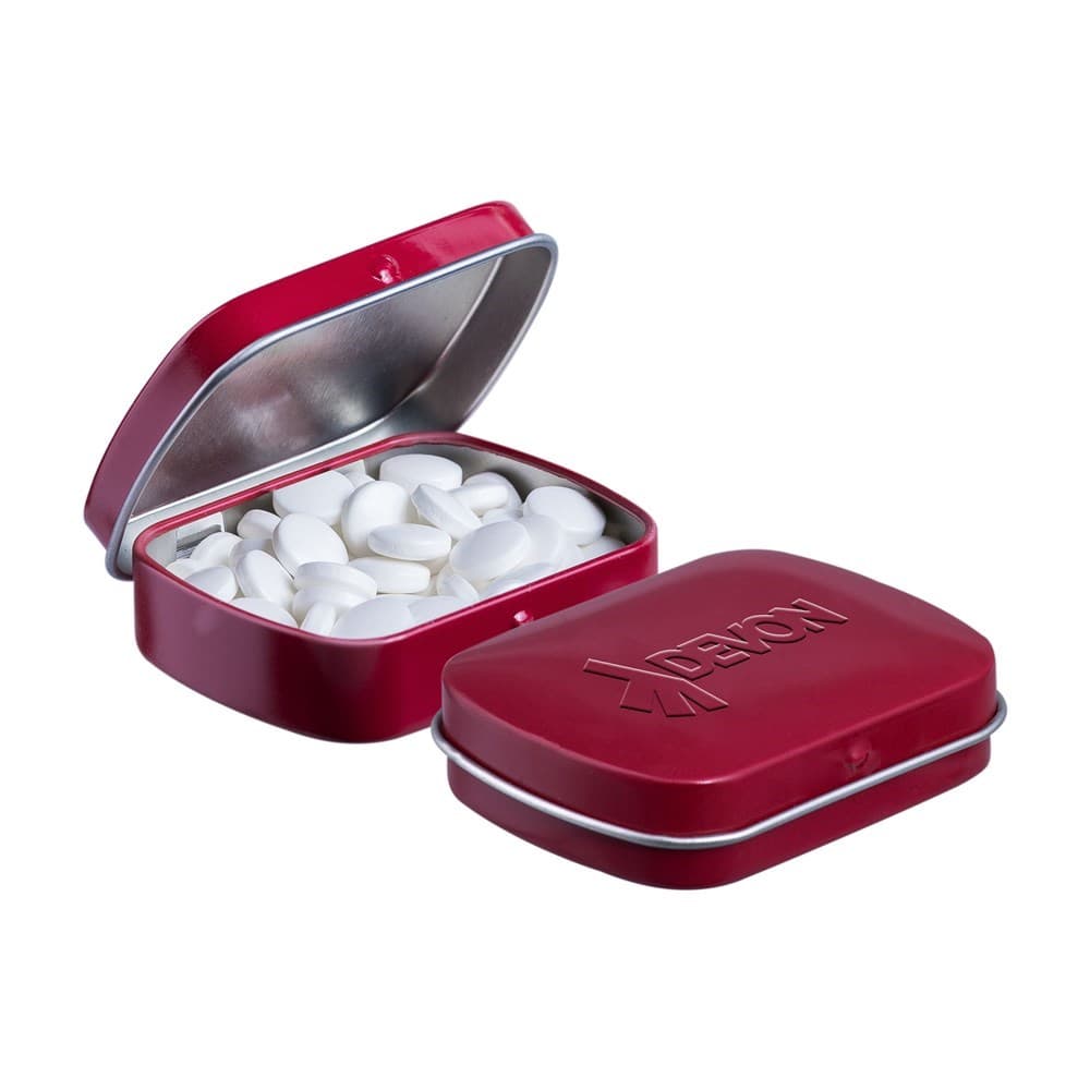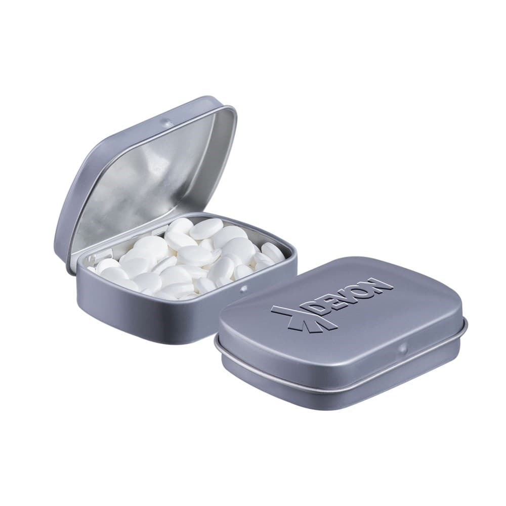 Mini scharnierblikje wit met ca. 23 gram pepermunt en voorzien van embossing. Inclusief ingrediëntensticker en seal (eenmalige malkosten 395,-)
