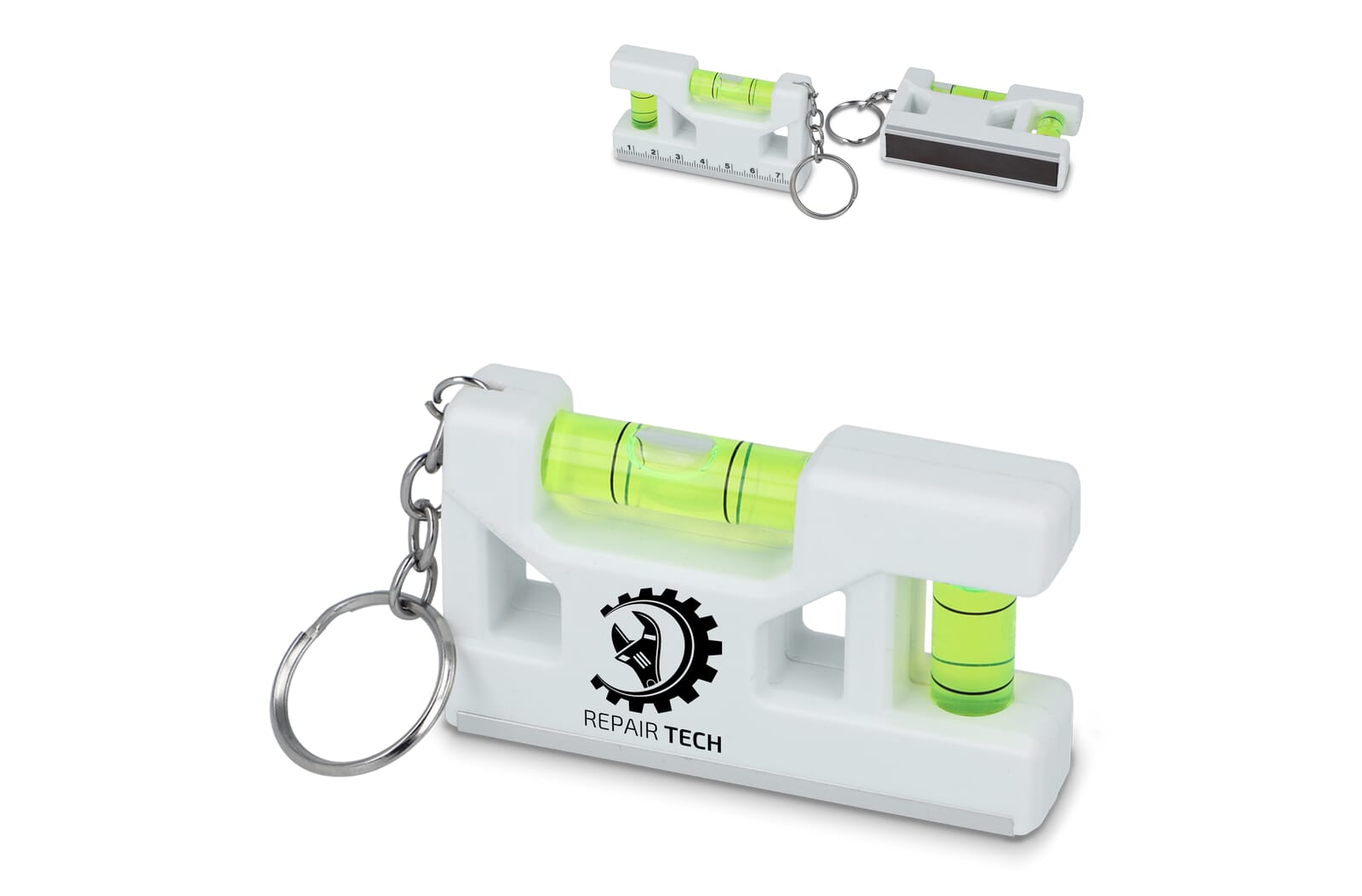 Multifunctionele sleutelhanger met geïntegreerde verticale en horizontale waterpassen, een liniaal van 7 cm en een magneet. Ideaal voor kleine waterpastaken, snelle metingen.