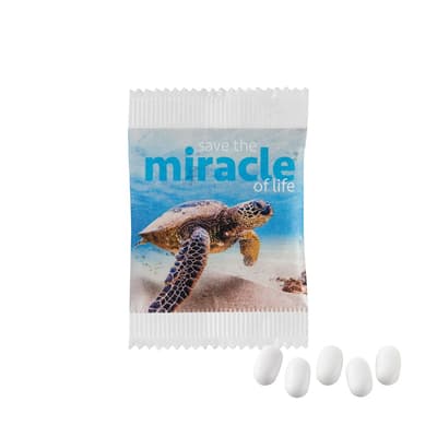 Wit papieren zakje gevuld met ca. 5 Tic-Tac's met mint- of sinaasappelsmaak, aan beide zijden full colour bedrukt