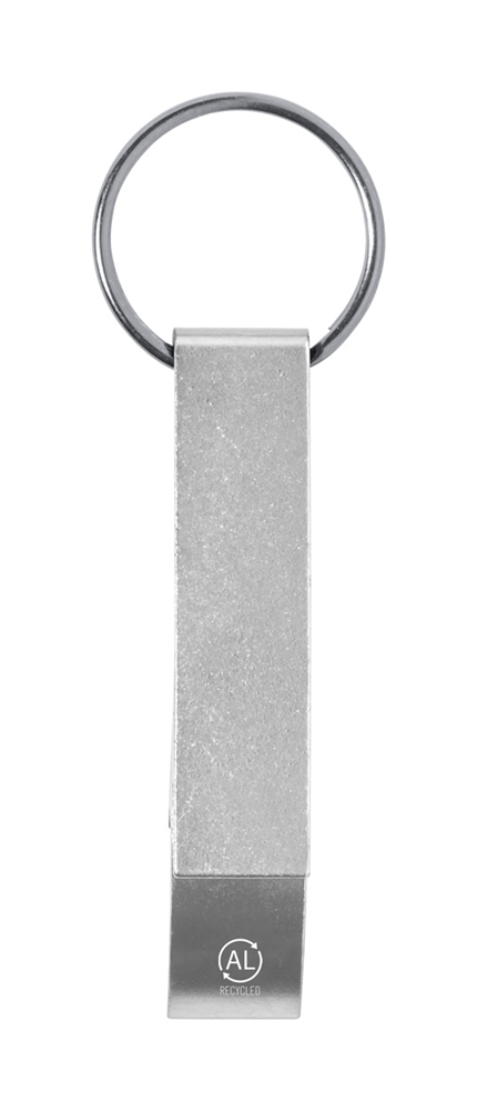 Fles- en blikopener van gerecycled aluminium met metalen sleutelhanger.
