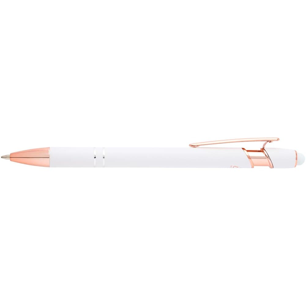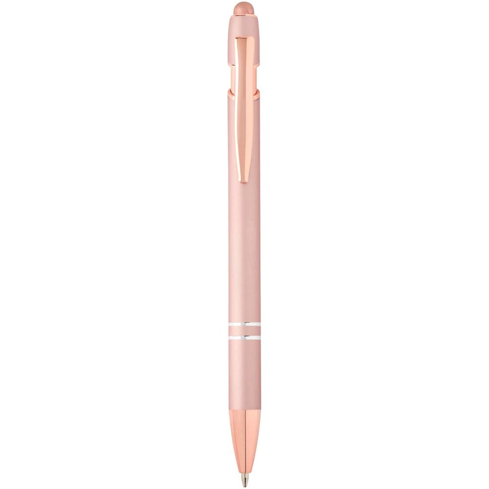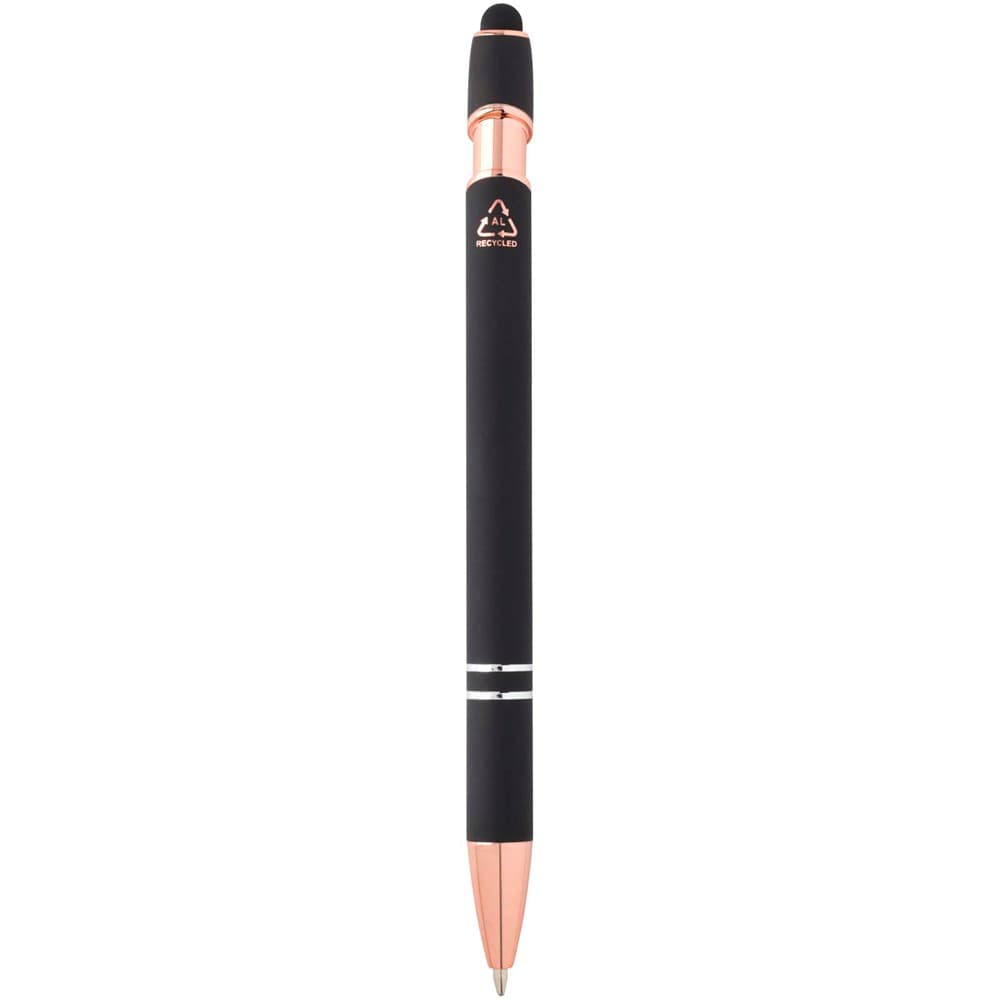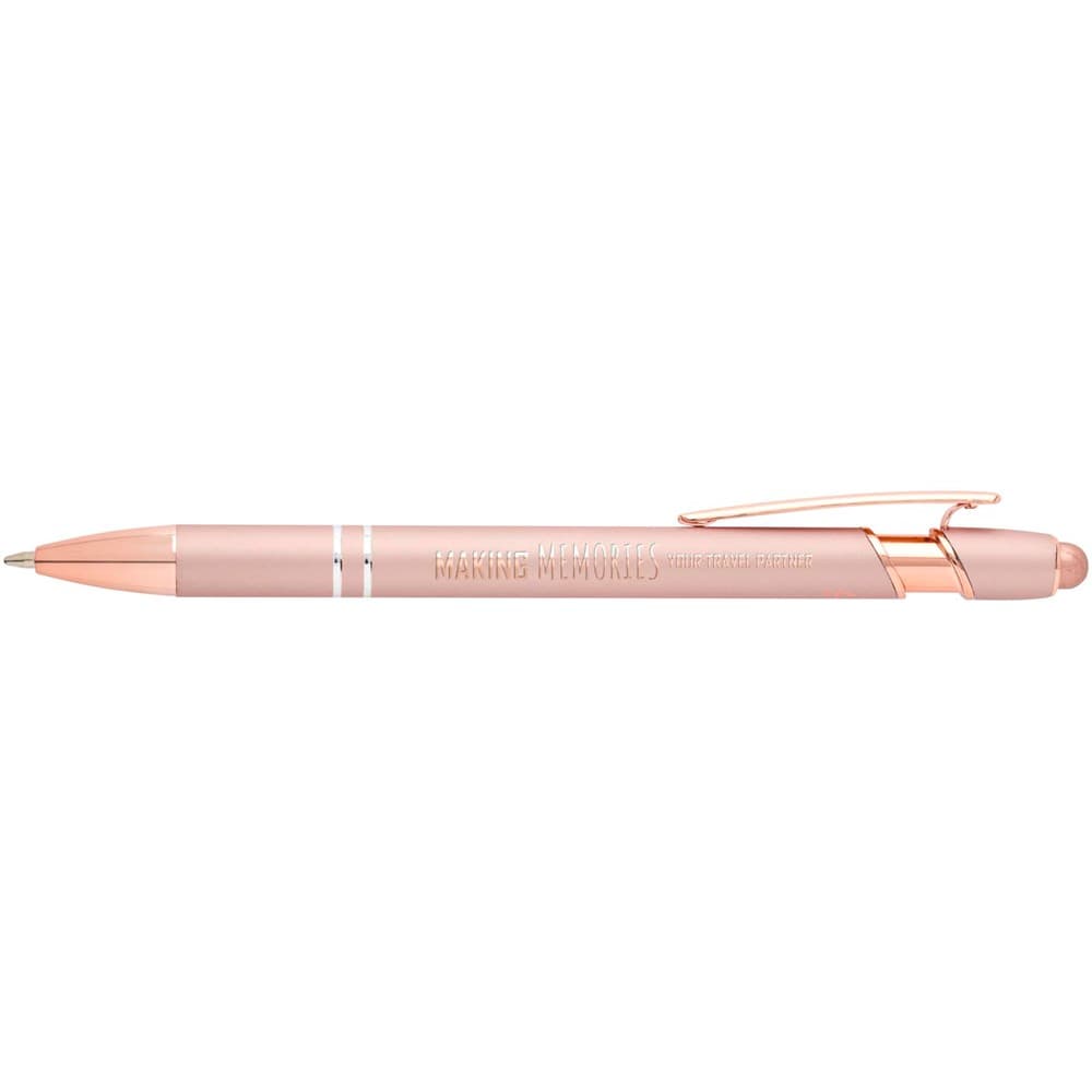 De Nanna balpen met roségouden afwerking heeft een houder van gerecycled aluminium met een siliconen touch stylus. Gerecycled aluminium vermindert de hoeveelheid afval op stortplaatsen en draagt bij aan het behoud van natuurlijke hulpbronnen, met als doel de uitstoot van broeikasgassen te verminderen. Inktkleur: Blauw. Schrijflengte: 800 meter. Stiftmaat: 1,0 mm.