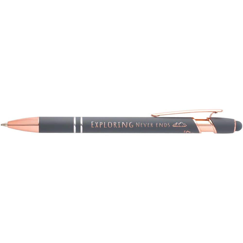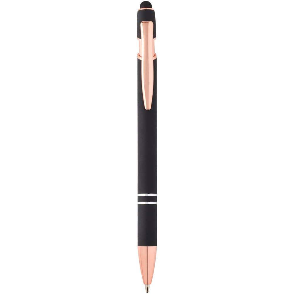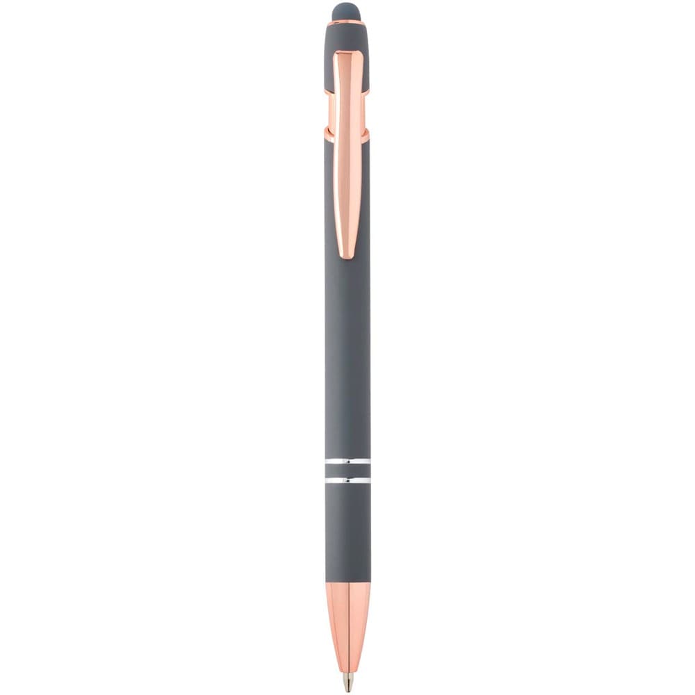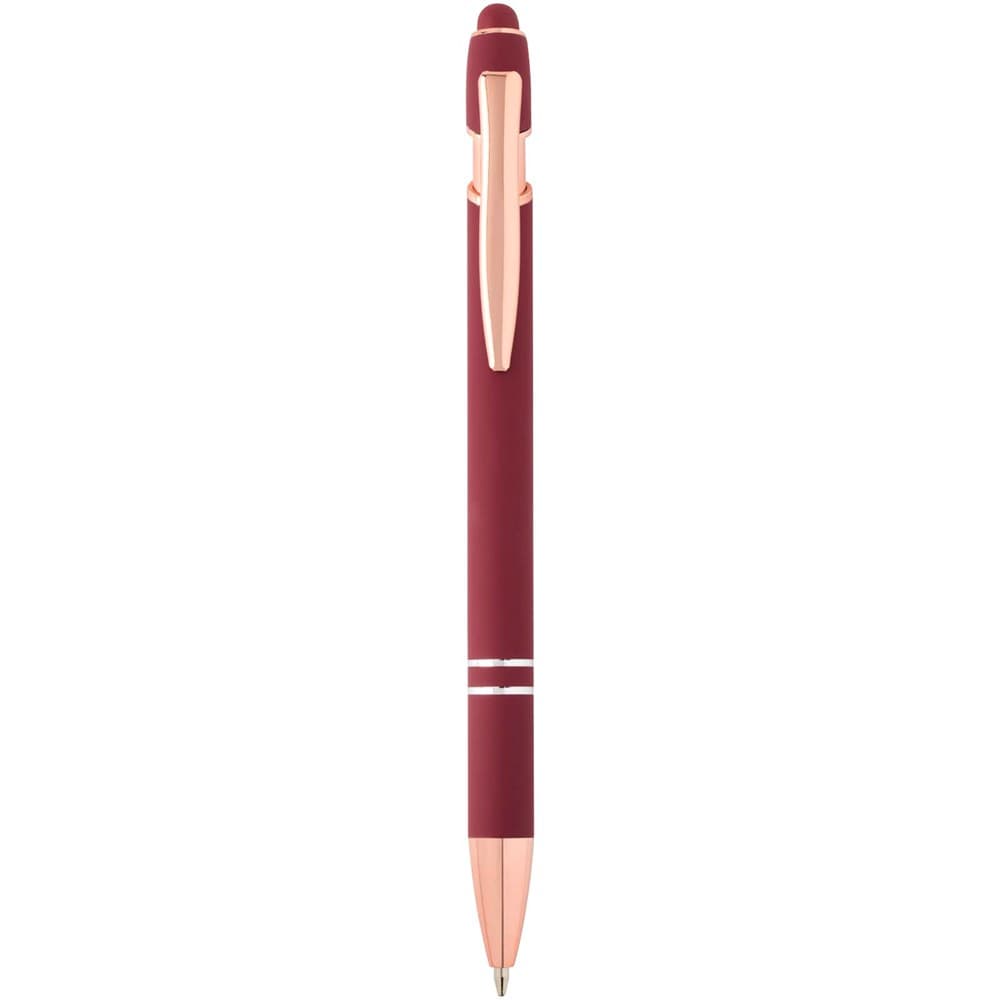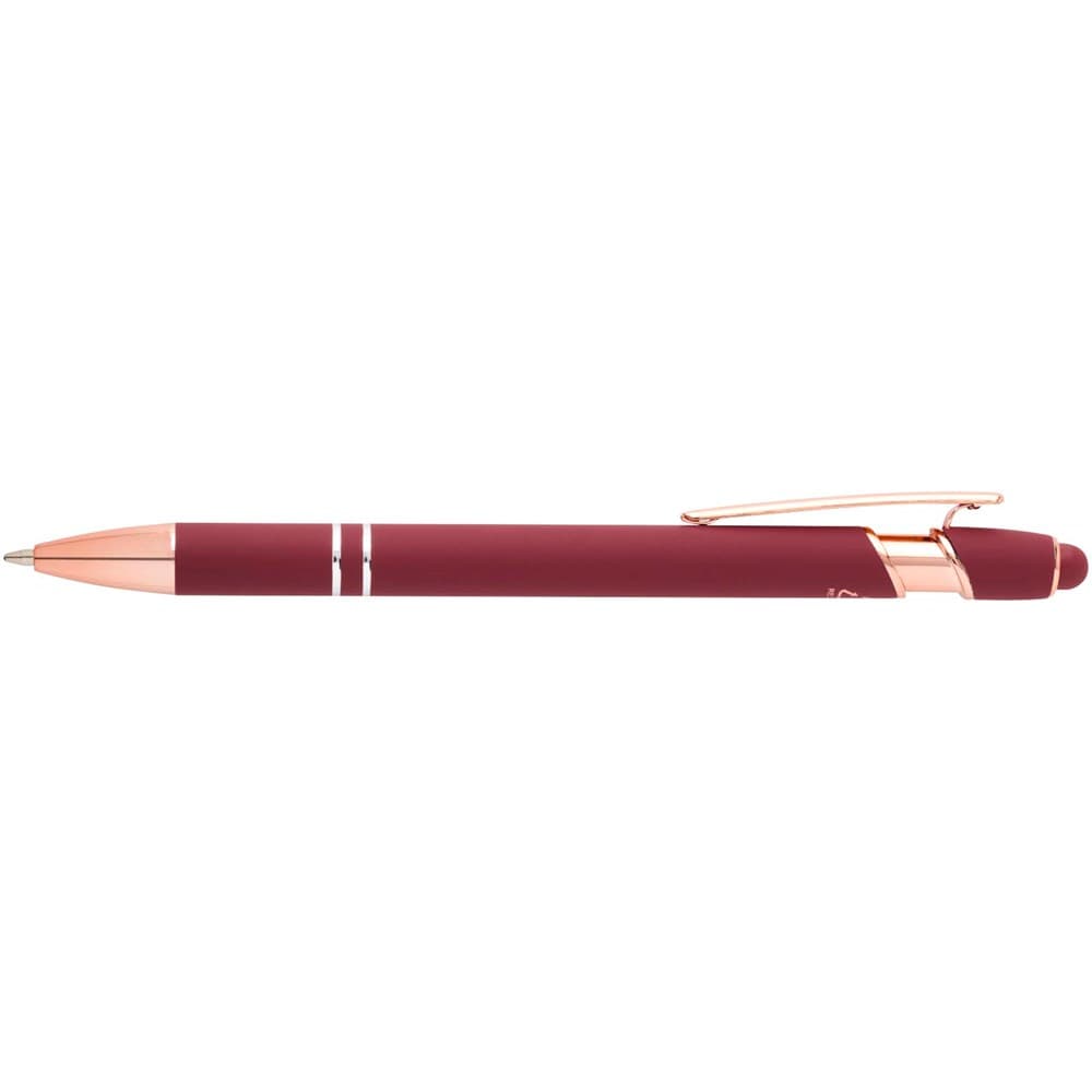 De Nanna balpen met roségouden afwerking heeft een houder van gerecycled aluminium met een siliconen touch stylus. Gerecycled aluminium vermindert de hoeveelheid afval op stortplaatsen en draagt bij aan het behoud van natuurlijke hulpbronnen, met als doel de uitstoot van broeikasgassen te verminderen. Inktkleur: Blauw. Schrijflengte: 800 meter. Stiftmaat: 1,0 mm.