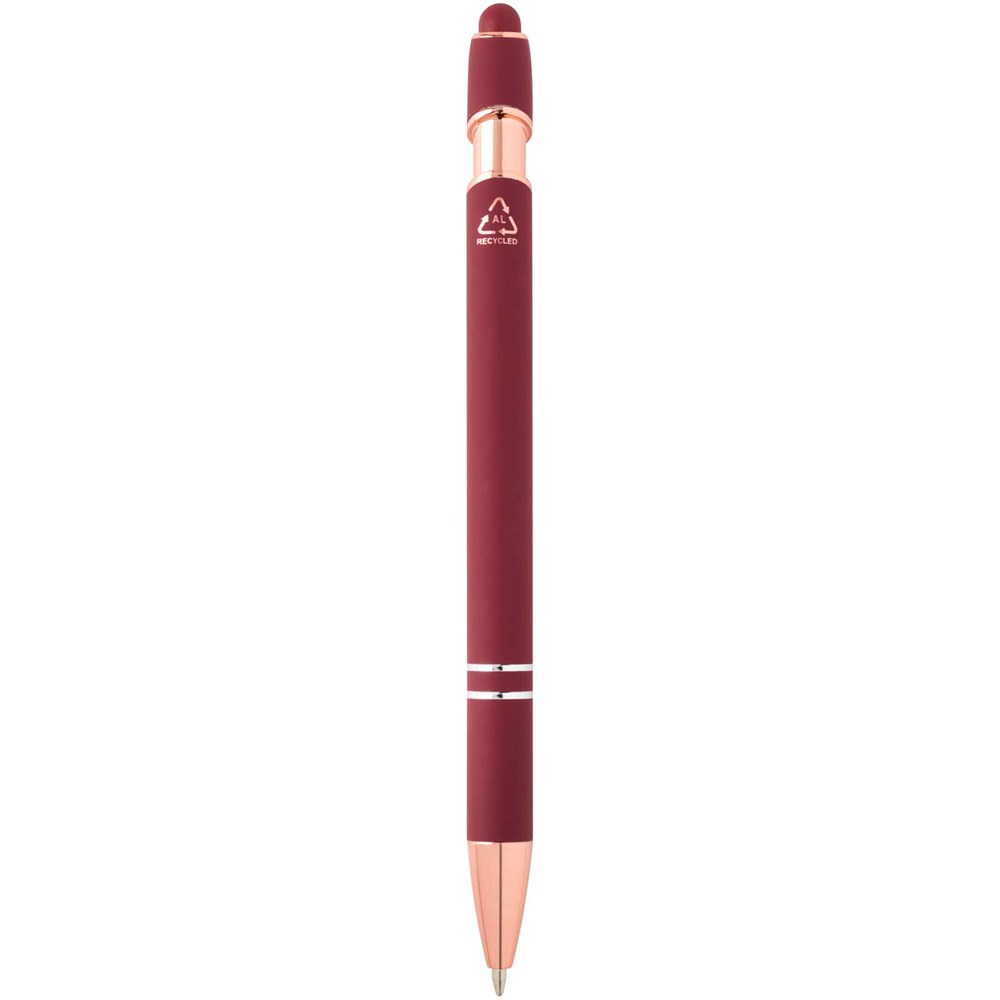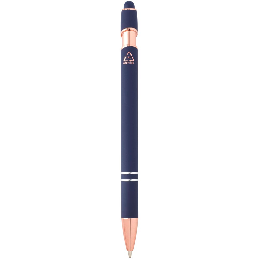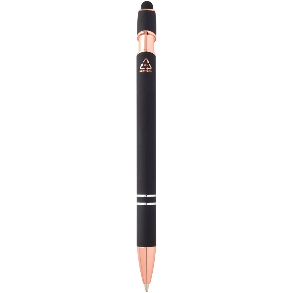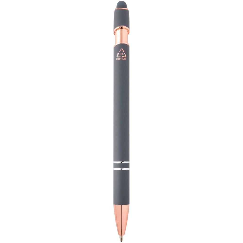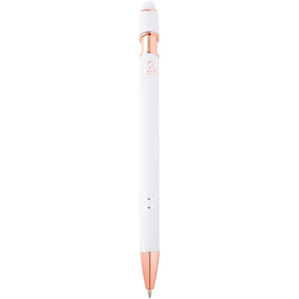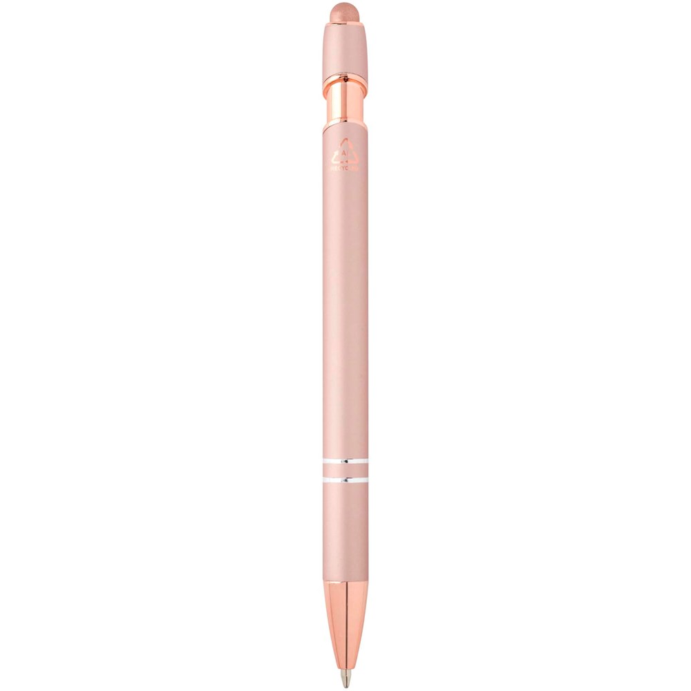 De Nanna balpen met roségouden afwerking heeft een houder van gerecycled aluminium met een siliconen touch stylus. Gerecycled aluminium vermindert de hoeveelheid afval op stortplaatsen en draagt bij aan het behoud van natuurlijke hulpbronnen, met als doel de uitstoot van broeikasgassen te verminderen. Inktkleur: zwart. Schrijflengte: 800 meter. Stiftmaat: 1,0 mm.