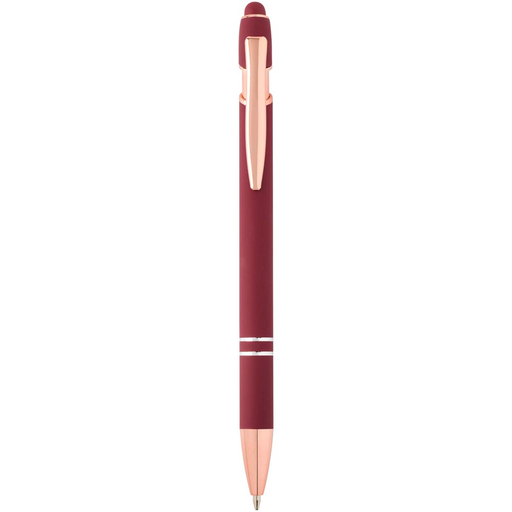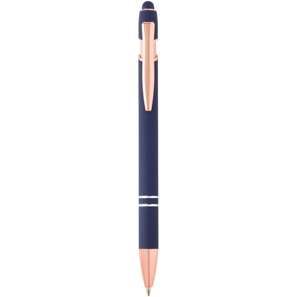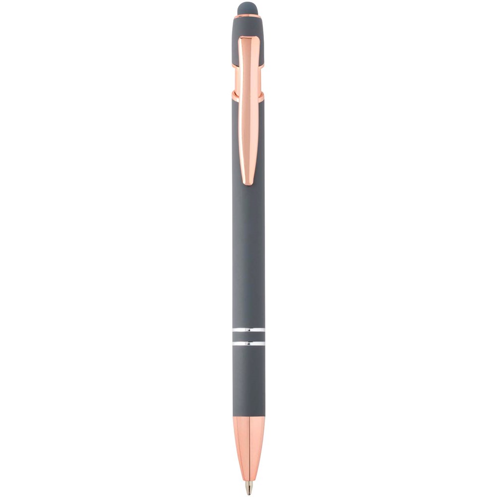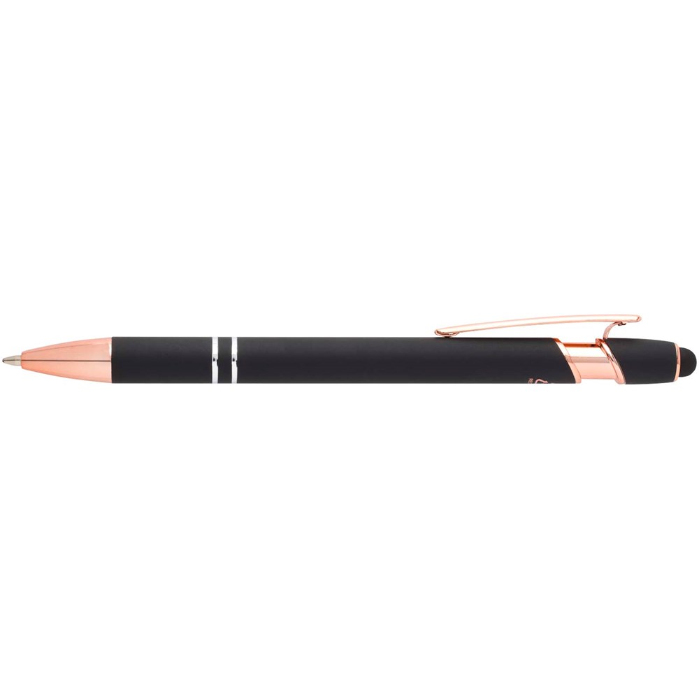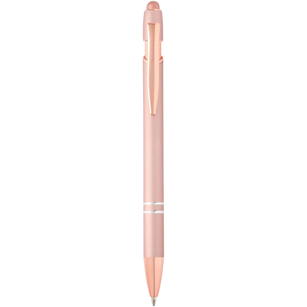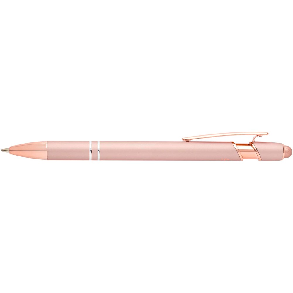 De Nanna balpen met roségouden afwerking heeft een houder van gerecycled aluminium met een siliconen touch stylus. Gerecycled aluminium vermindert de hoeveelheid afval op stortplaatsen en draagt bij aan het behoud van natuurlijke hulpbronnen, met als doel de uitstoot van broeikasgassen te verminderen. Inktkleur: zwart. Schrijflengte: 800 meter. Stiftmaat: 1,0 mm.