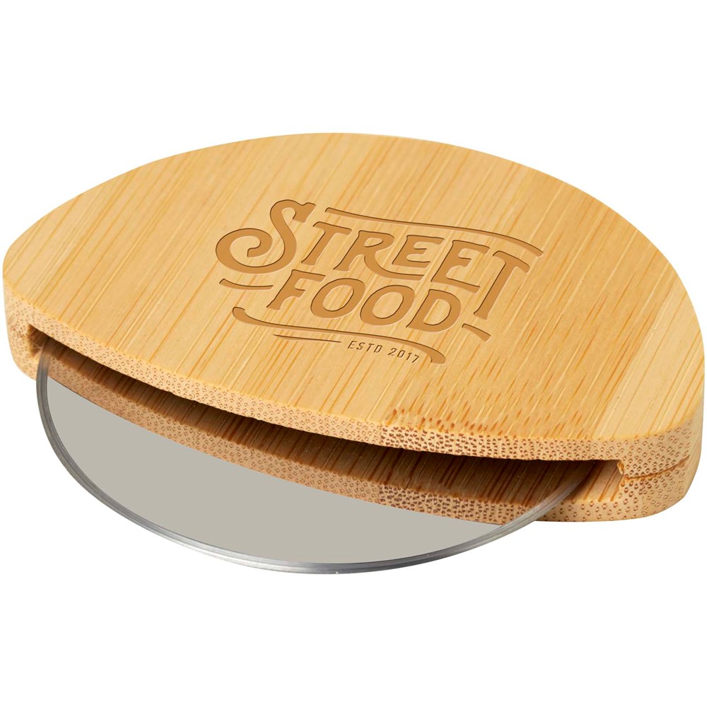Pizzasnijder met bamboe handgreep en roestvrijstalen mes.