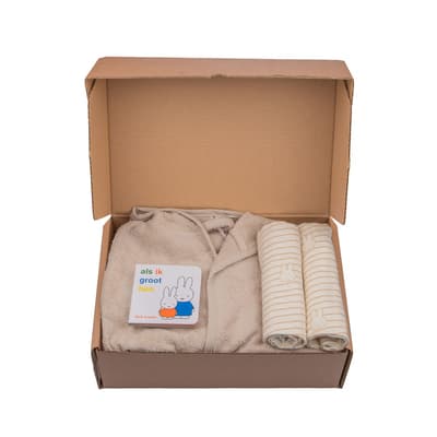 Nijntje geboorte cadeauset M, in samenwerking met Jollein. Bevat een Nijntje badjas, 2 Nijntje hydrofieldoeken en een Nijntje boekje. Verpakt in een bruin doosje met Hello Baby etiket.