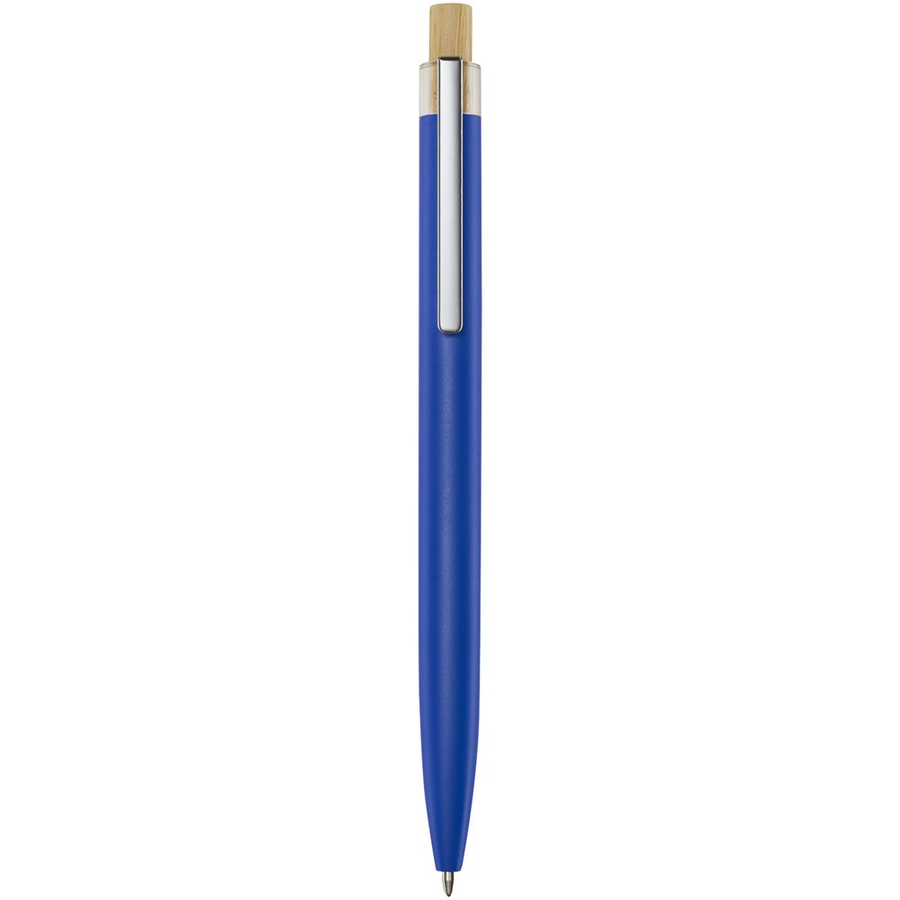 De Nooshin balpen is gemaakt van gerecycled aluminium, wat minder energie kost dan het produceren van aluminium uit grondstoffen. Het vermindert ook de hoeveelheid afval op stortplaatsen en draagt bij aan het behoud van natuurlijke hulpbronnen met als doel de uitstoot van broeikasgassen te beperken. De drukknop is gemaakt van bamboe. Inktkleur: zwart. Schrijflengte: 800 meter. Stiftmaat: 1,00 mm.