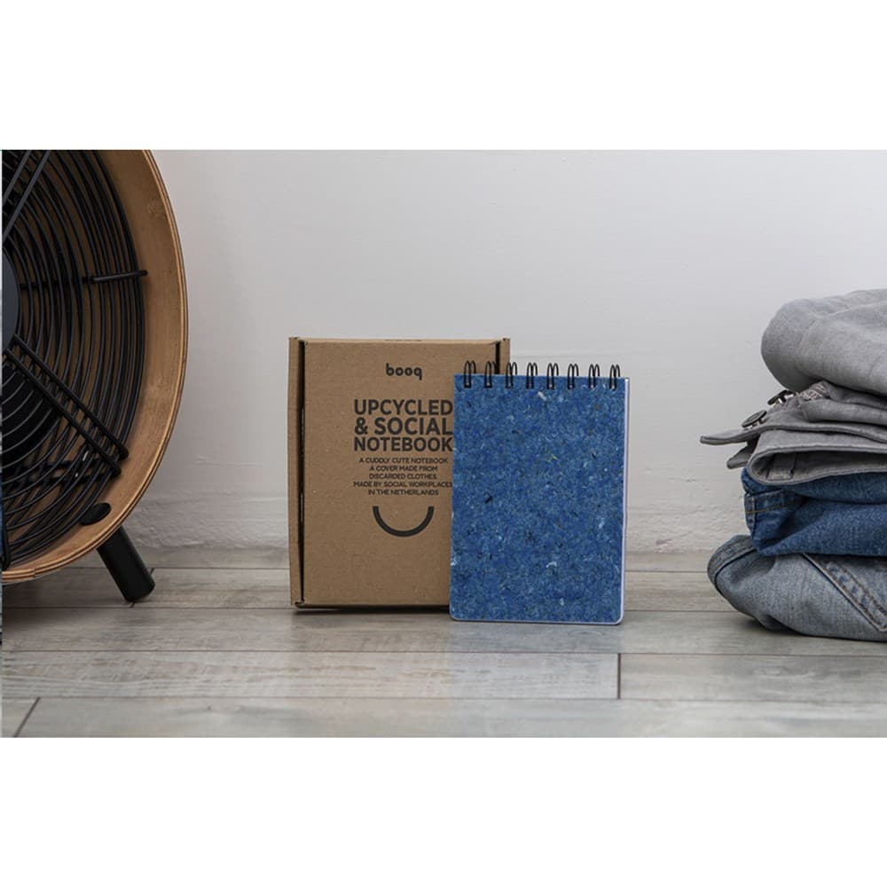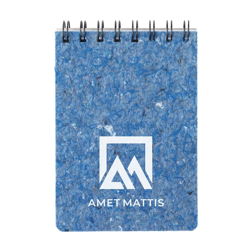 WoW! A6-notitieboekje met een wire-o-binding en ca. 96 vel/192 pagina's gelinieerd, houtvrij offset schrijfpapier (90 g/m²). De omslag is gemaakt van upcycled textiel. Oud textiel wordt verzameld en omgevormd tot vilt. Vilt is een niet-geweven materiaal dat wordt gemaakt door de vezels samen te drukken met warmte, vocht en druk. Sociale werkplekken lasersnijden de vellen en bevestigen deze aan de notitieboekjes. Optioneel: Per stuk in kraft doos.