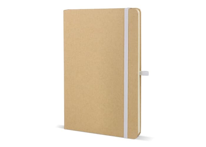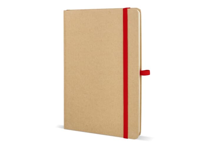 A5-notitieboek met kartonnen omslag, afgeronde hoeken, gekleurde elastische sluiting, leeslint en pennenlus. Bevat 80 gelinieerde crèmekleurige pagina’s van gerecycled papier. Een praktische en milieubewuste keuze voor dagelijks gebruik.