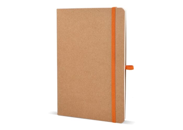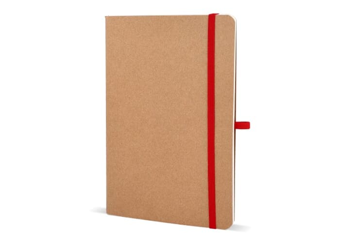 A5-notitieboek met een zachte kaft van kraftpapier, afgeronde hoeken, gekleurde elastische sluiting en pennenlus. Het bevat 60 gelinieerde crèmekleurige vellen van FSC-gecertificeerd papier. Een praktische en natuurlijk ogende optie voor dagelijkse aantekeningen.