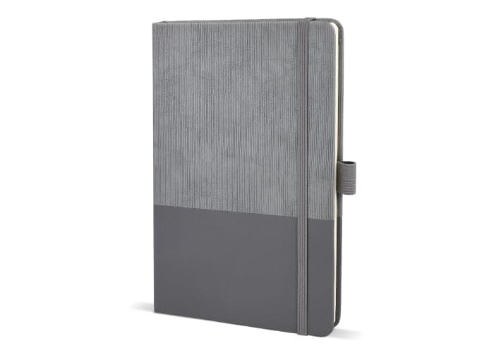 A5-notitieboek van thermo PU-leer met een moderne, premium uitstraling. Voorzien van een elastische sluiting, lintmarker en pennenlus. Het bevat 80 gelinieerde crèmekleurige pagina’s van FSC-gecertificeerd papier.