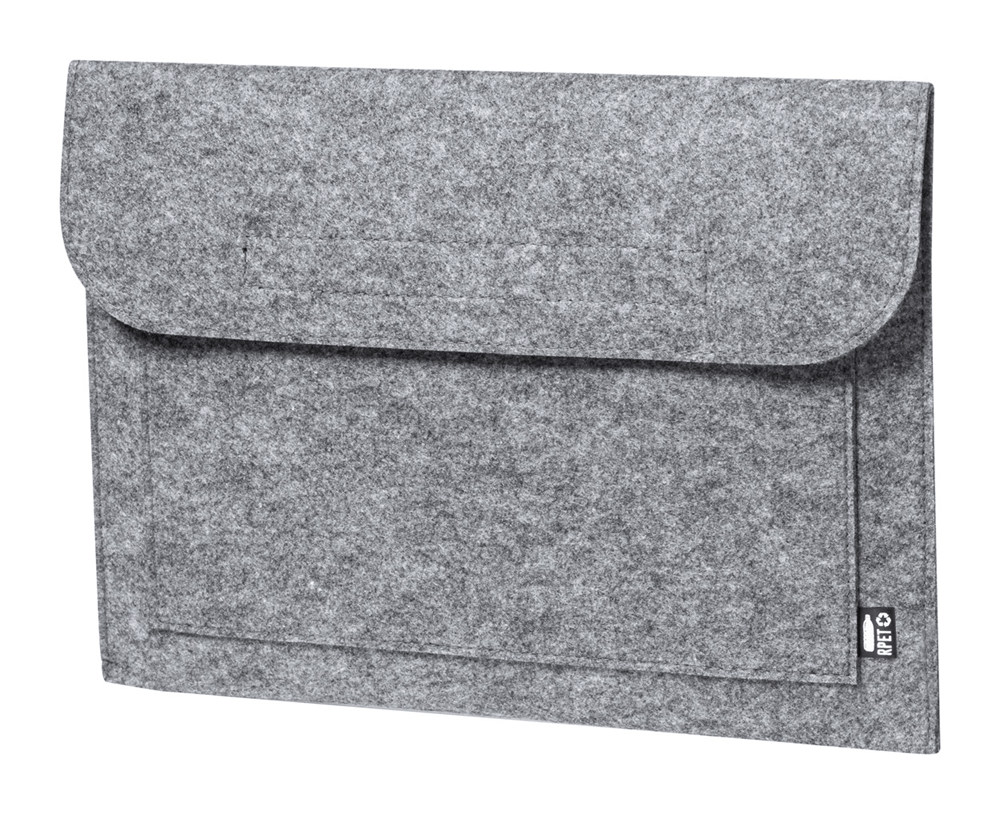 RPET vilten laptoptas met voorvak en klittenbandsluiting. Met onderscheidend RPET-label.