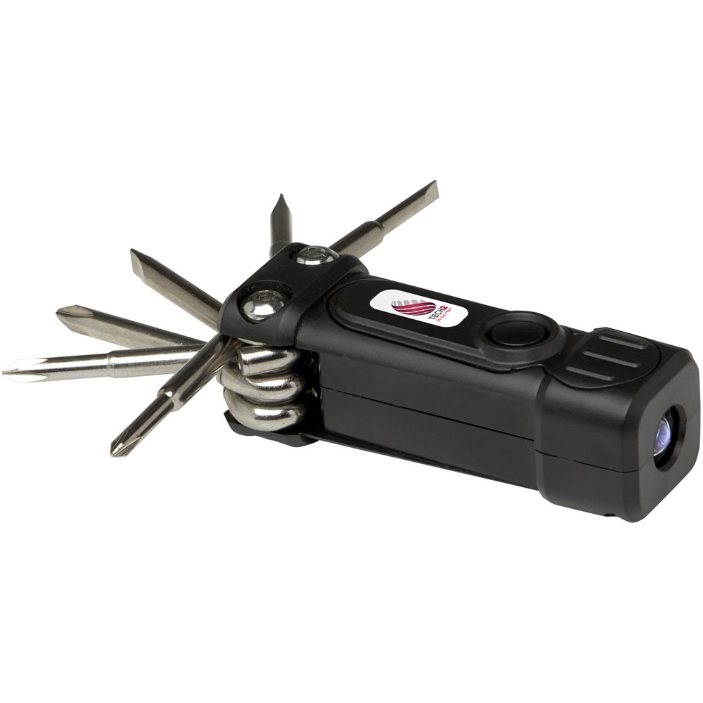 Compacte 8-in-1 schroevendraaierset met zaklamp gemaakt van 20% RCS-gecertificeerd gerecycled plastic. De Recycled Claim Standard (RCS) controleert de gerecyclede inhoud van een product in de hele toeleveringsketen. Dit praktische gereedschap heeft 2 led-lampjes, 3 kruiskoppen en 3 platte koppen. Wordt geleverd met drie LR44-batterijen. Verpakt in een STAC-geschenkverpakking van duurzame bronnen.