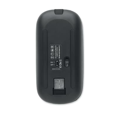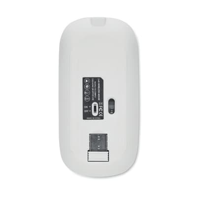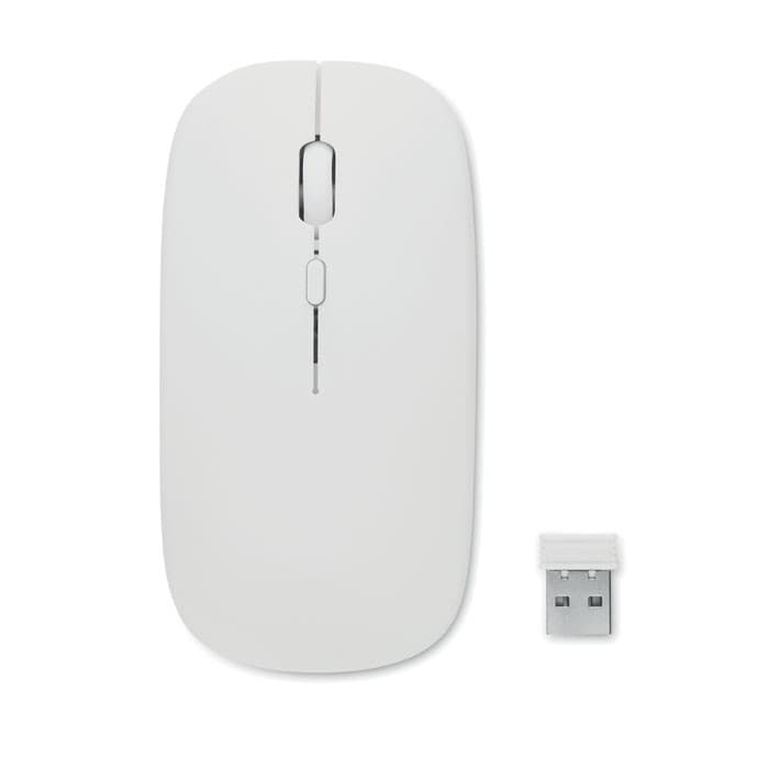 Optische draadloze muis, vervaardigd uit gerecycled ABS en voorzien van een oplaadbare USB-batterij van 500 mAh. Toepasbaar binnen computer en telefonie bedrukken.