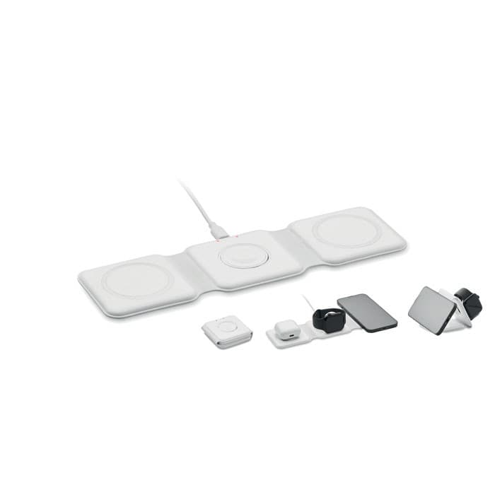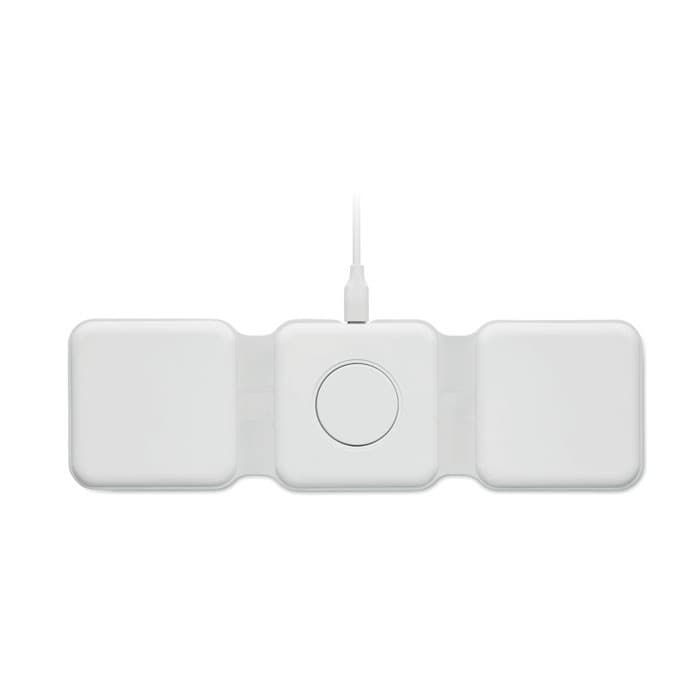 3 in 1 opvouwbaar oplaadstation van ABS. Het heeft 3 draadloze oplaadpunten (15w). Ingang: 2-in-1 Type-C en Type-A. Geschikt voor alle apparaten met QI-functie, zoals de nieuwste Androids, iPhone® 8, X en nieuwer. Ook geschikt voor iWatch.
