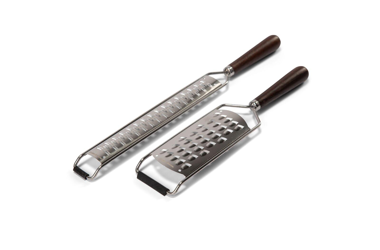 Set van twee Orrefors Jernverk raspen, verpakt in een luxe geschenkverpakking. De lange rasp is geschikt voor het raspen van b.v. kazen en citrusvruchten in fijne vlokken. De brede gourmetrasp is zeer geschikt om grotere vlokken te raspen. Beide raspen hebben handvatten in bruin wengéhout. De rubberen strip aan de voorzijde is gekanteld tegen het oppervlak. Kleine rasp heeft een afmeting van 300 x 65 x 18 mm en de grote rasp een afmeting van 380 x 38 x 25mm