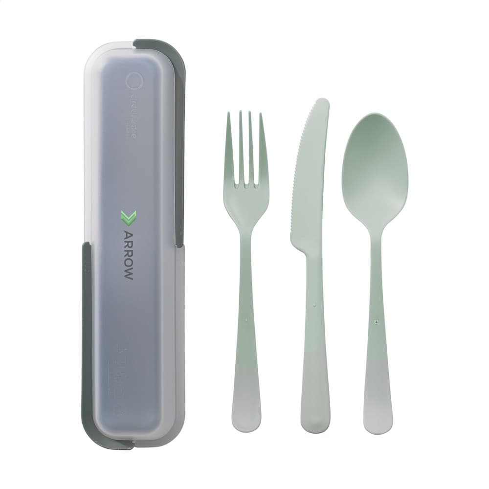 3-delige, herbruikbare kunststof bestekset van het merk Circulware. De set bestaat uit een lepel, vork en kartelmes. Uitermate geschikt tijdens trektochten, kamperen of onderweg. Licht in gewicht, praktisch en handzaam. Vaatwasserbestendig. Voor behoud van de opdruk wordt met de hand afwassen aanbevolen. Magnetronbestendig. 100% recyclebaar. Hiermee draagt deze set bij aan een circulaire economie. Per set geleverd in een stevige, bijpassende opbergcassette. Dutch design. Made in Holland.