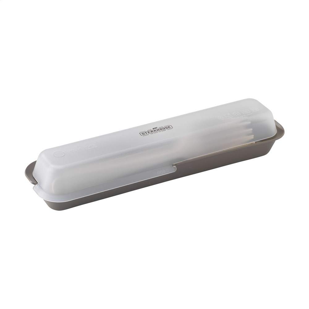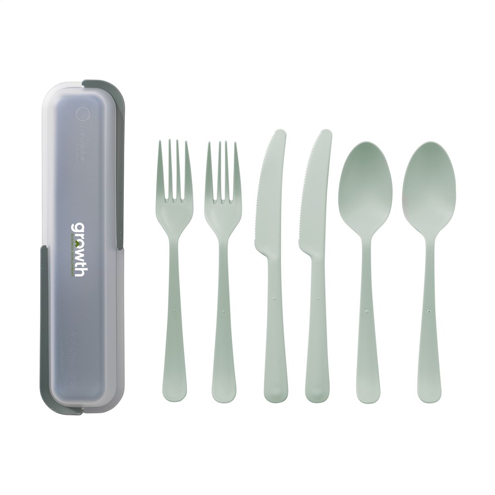 6-delige, herbruikbare kunststof bestekset van het merk Circulware. De set bestaat uit 2 lepels, 2 vorken en 2 kartelmessen. Uitermate geschikt tijdens trektochten, kamperen of onderweg. Licht in gewicht, praktisch en handzaam. Vaatwasserbestendig. Voor behoud van de opdruk wordt met de hand afwassen aanbevolen. Magnetronbesetndig. 100% recyclebaar. Hiermee draagt deze set bij aan een circulaire economie. Per set geleverd in een stevige, bijpassende cassette. Dutch design. Made in Holland.