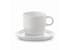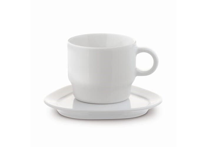 Kop en schotel van hoogwaardig porselein uit de 'Satellite' serie. Kop is stapelbaar en biedt een groot bedrukkingsoppervlakte. Het driehoekige schoteltje bied extra ruimte rondom het kopje. Geproduceerd in Europa.