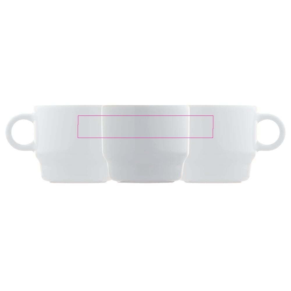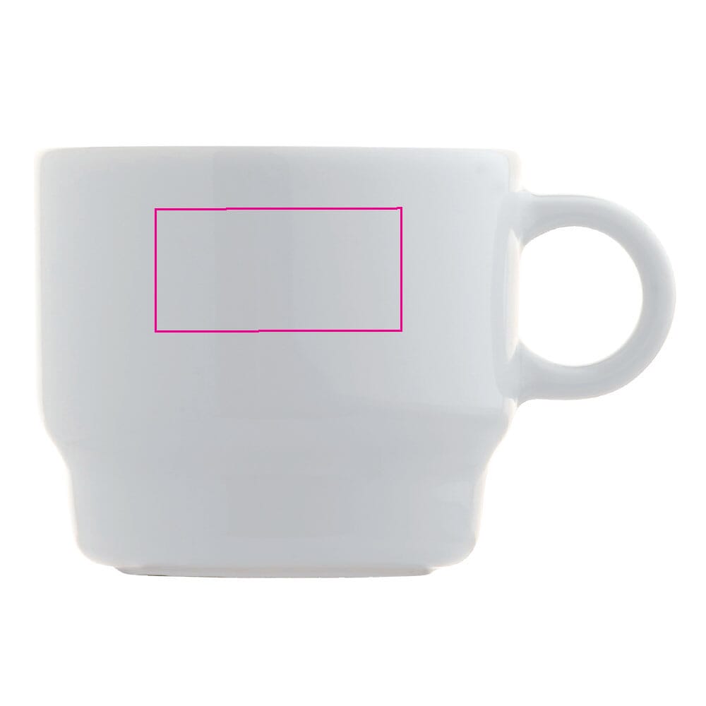 Kop en schotel van hoogwaardig porselein uit de 'Satellite' serie. Kop is stapelbaar en biedt een groot bedrukkingsoppervlakte. Het vierkante schoteltje bied extra ruimte rondom het kopje. Geproduceerd in Europa.